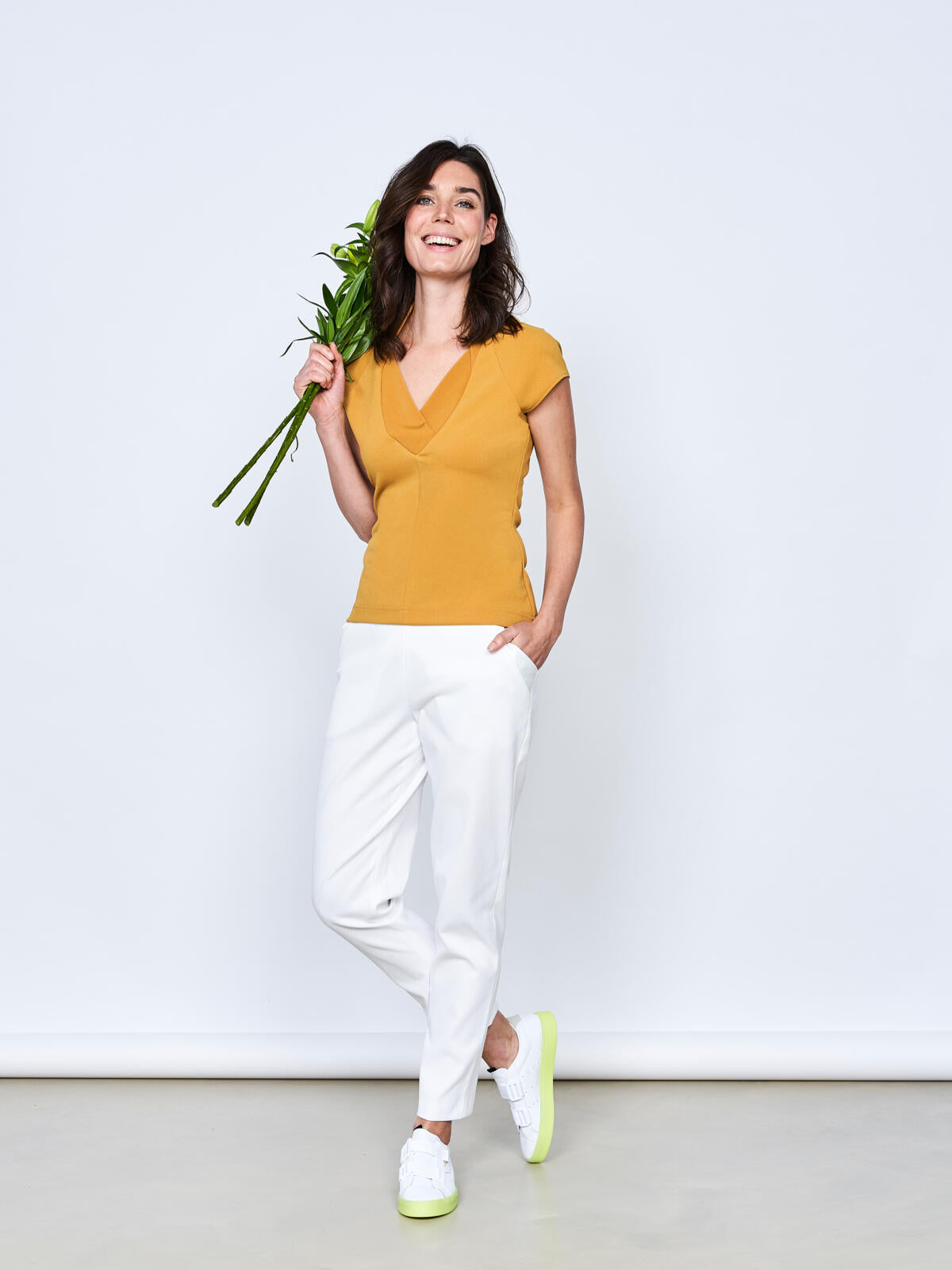 Deze stijlvolle top heeft een mooie V-hals met gedrapeerd effect en korte mouwen. Door de deelnaden sluit het model elegant aan op het lichaam en creëert het een vrouwelijke, licht getailleerde pasvorm. Ideaal om te combineren met een broek of rok.