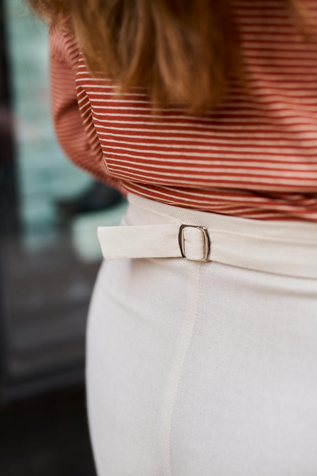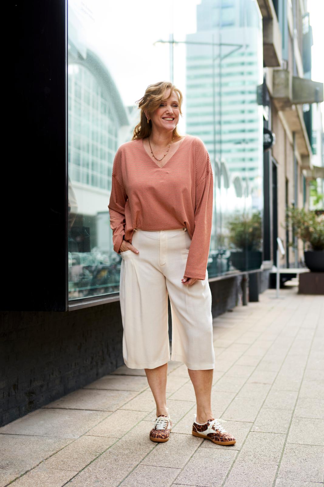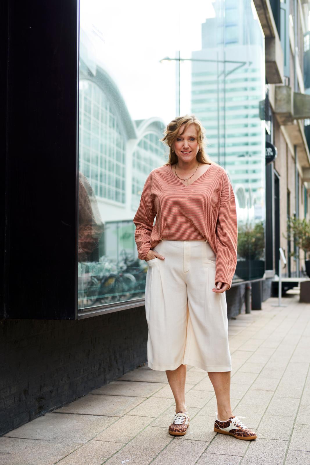 De culotte is hét nieuwe trenditem; deze ‘cropped wide leg’ heeft achter op de tailleband als leuk detaileen riempje met gespje. De zakken met paspelstrook zijn horizontaal verwerkt met een plooi eronder. Je kunt er afhankelijk van je stofkeuze zowel een stoere als nette versie van maken.