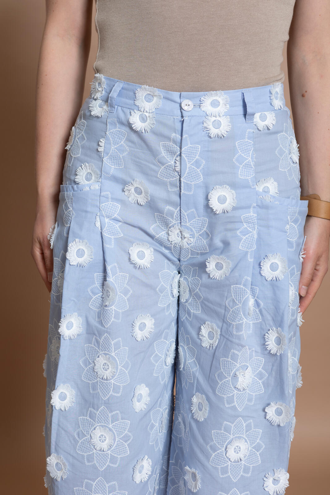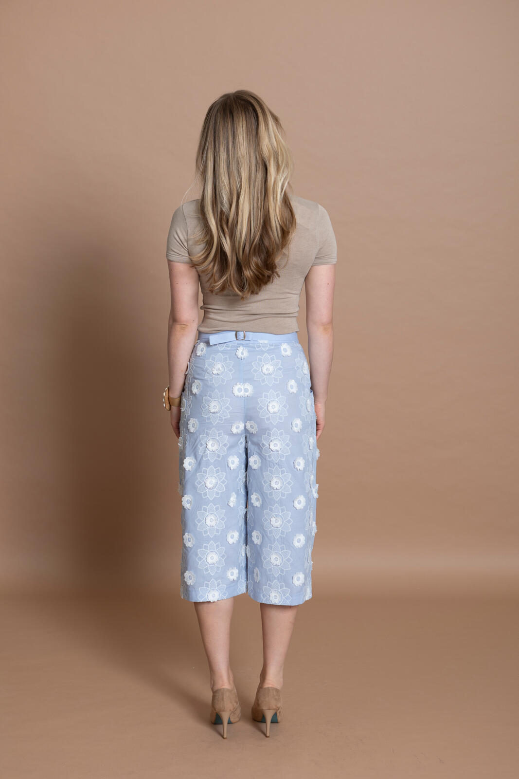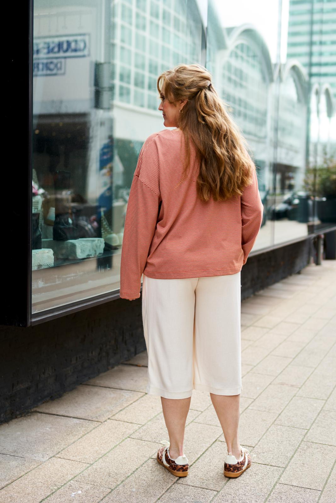 De culotte is hét nieuwe trenditem; deze ‘cropped wide leg’ heeft achter op de tailleband als leuk detaileen riempje met gespje. De zakken met paspelstrook zijn horizontaal verwerkt met een plooi eronder. Je kunt er afhankelijk van je stofkeuze zowel een stoere als nette versie van maken.