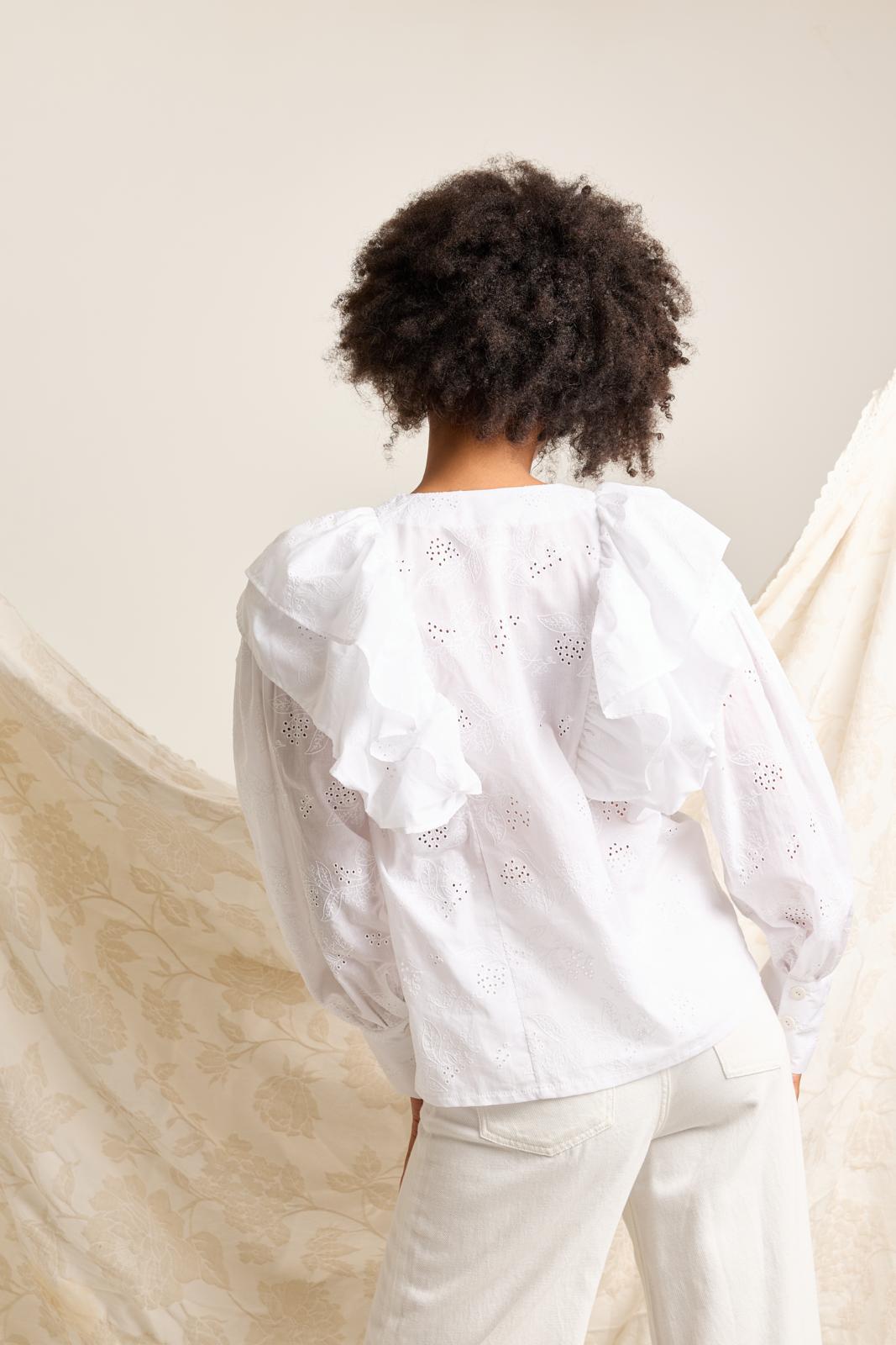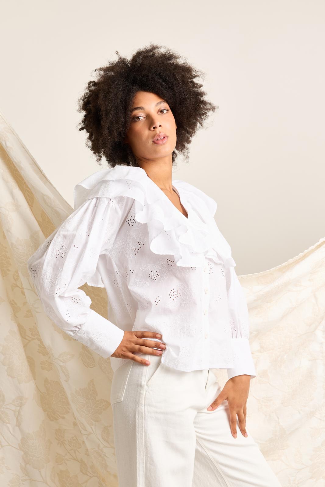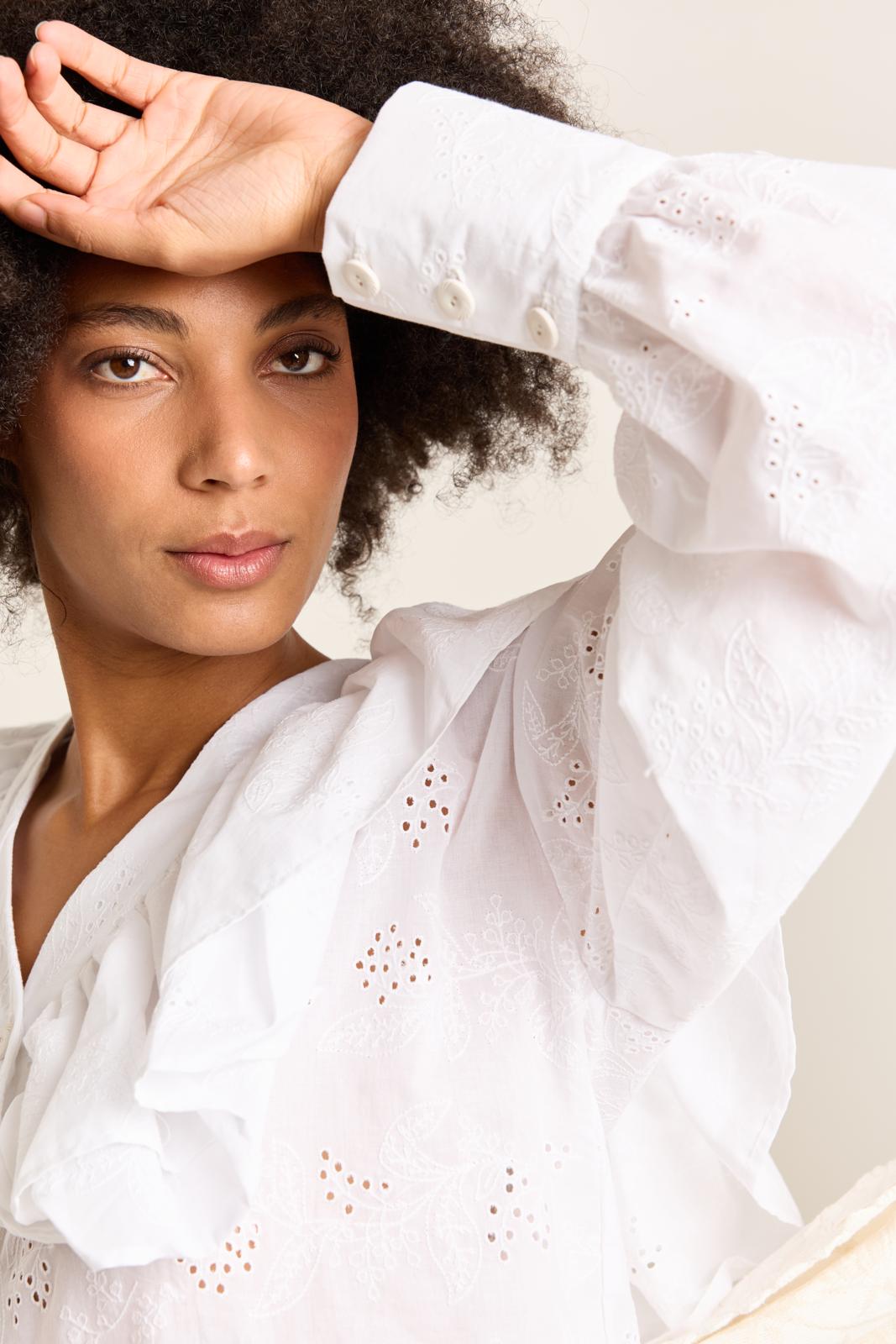 Ga all the way romantisch met ruches, plooi- en rimpeldetails in je outfit. Deze blouse met een dubbele ruche als kraag is daar perfect voor! De dubbele ruche loopt naar achter door en wordt tussen de deelnaden gestikt. De lange manchetten sluiten met drie knoopjes.
