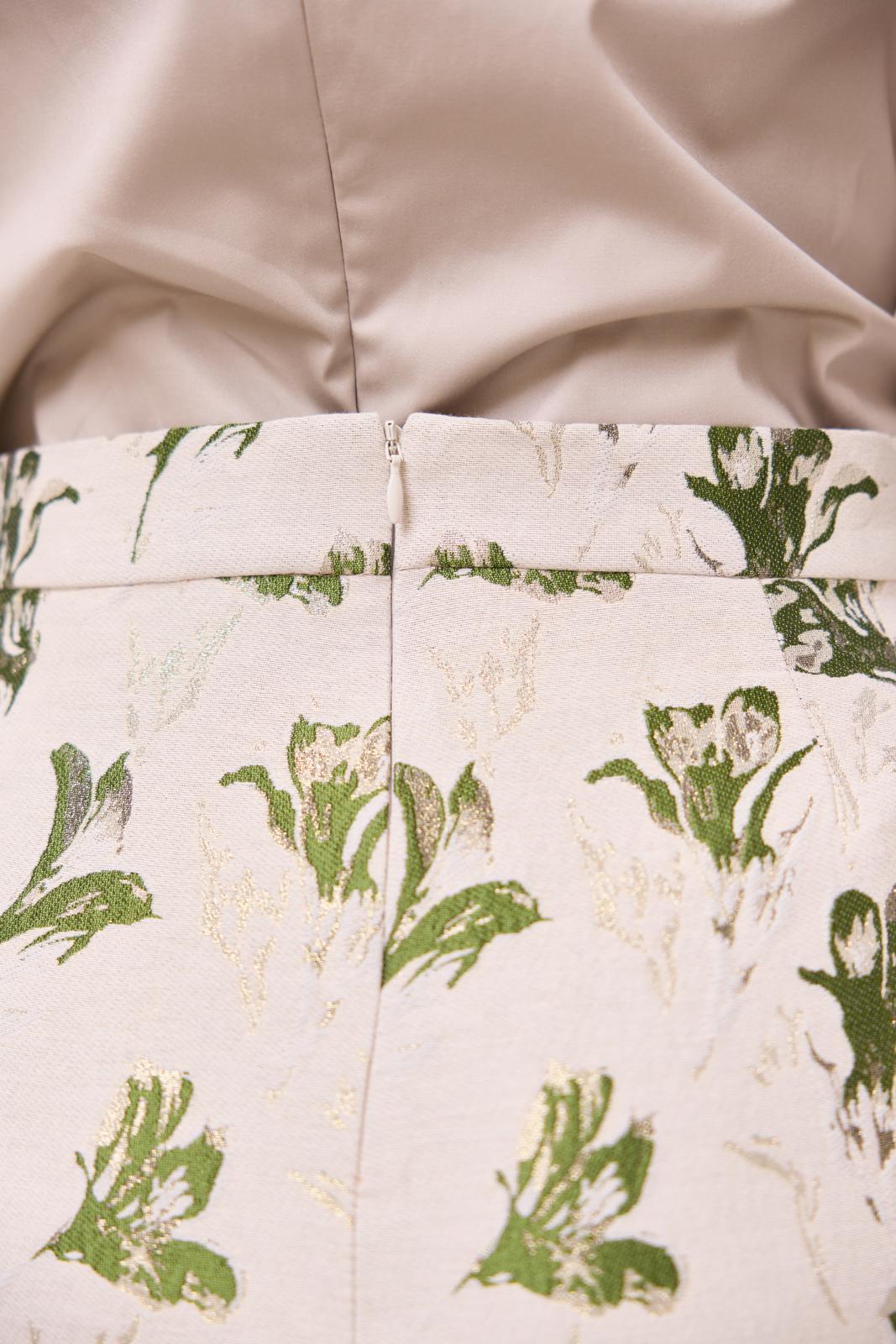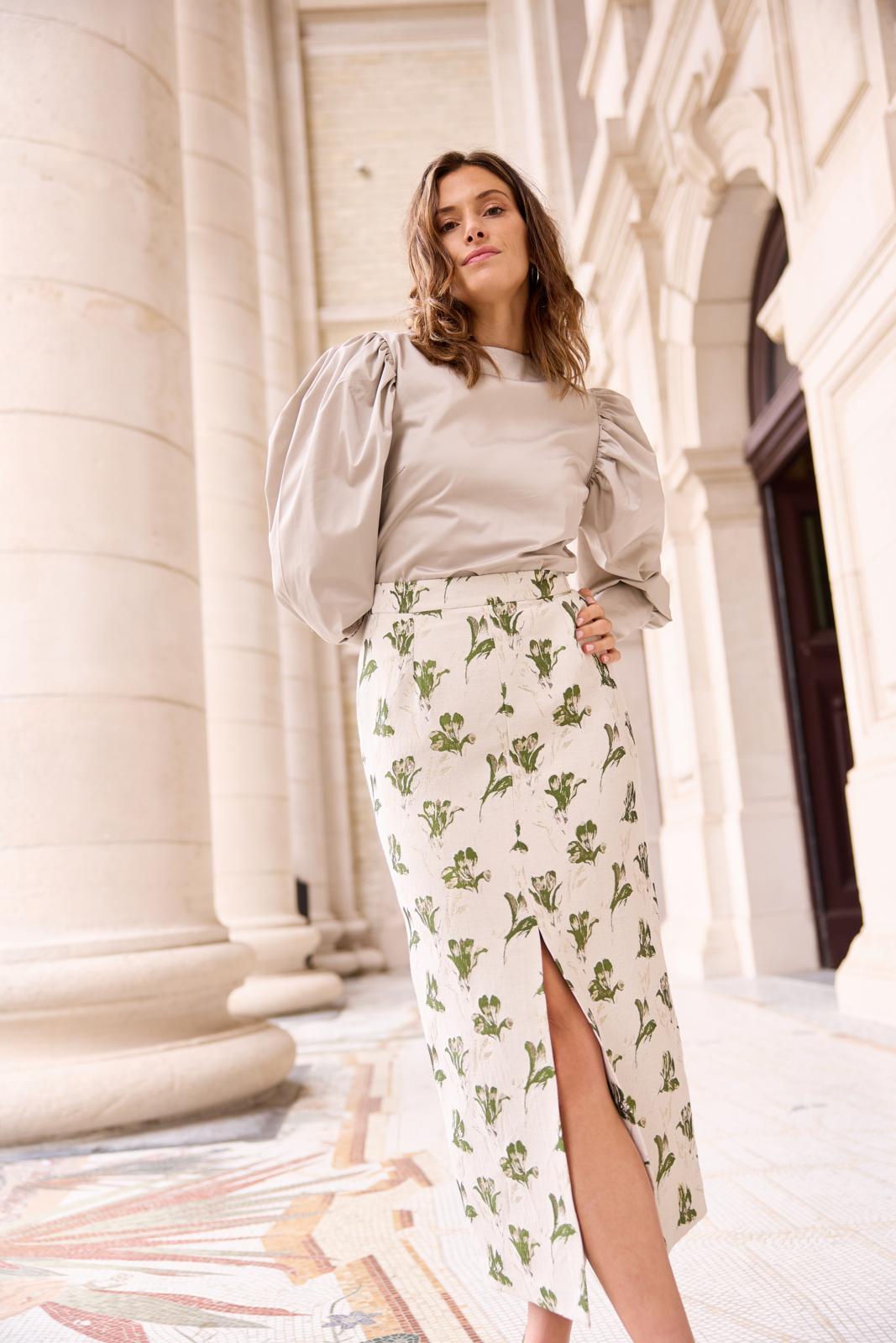 Deze hippe midi-kokerrok is een slank aansluitend model met flink loopsplit middenachter en een blinde rits. De jacquardstof met lurex geeft de rok extra cachet.