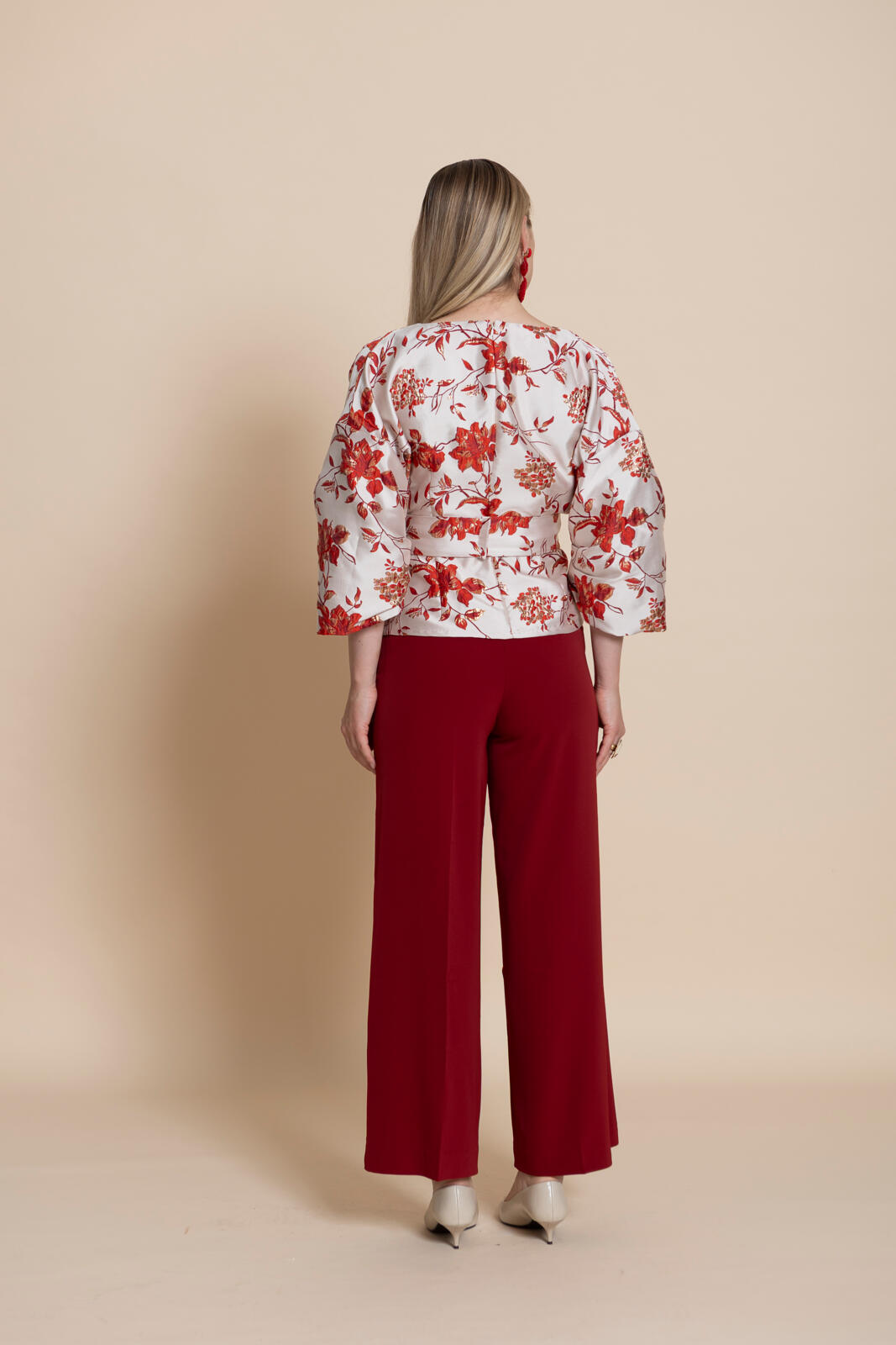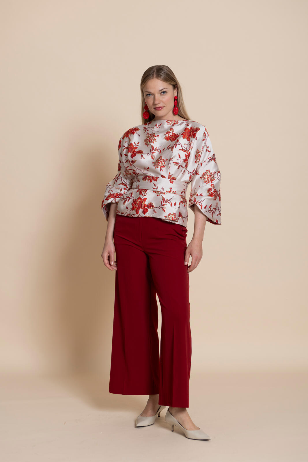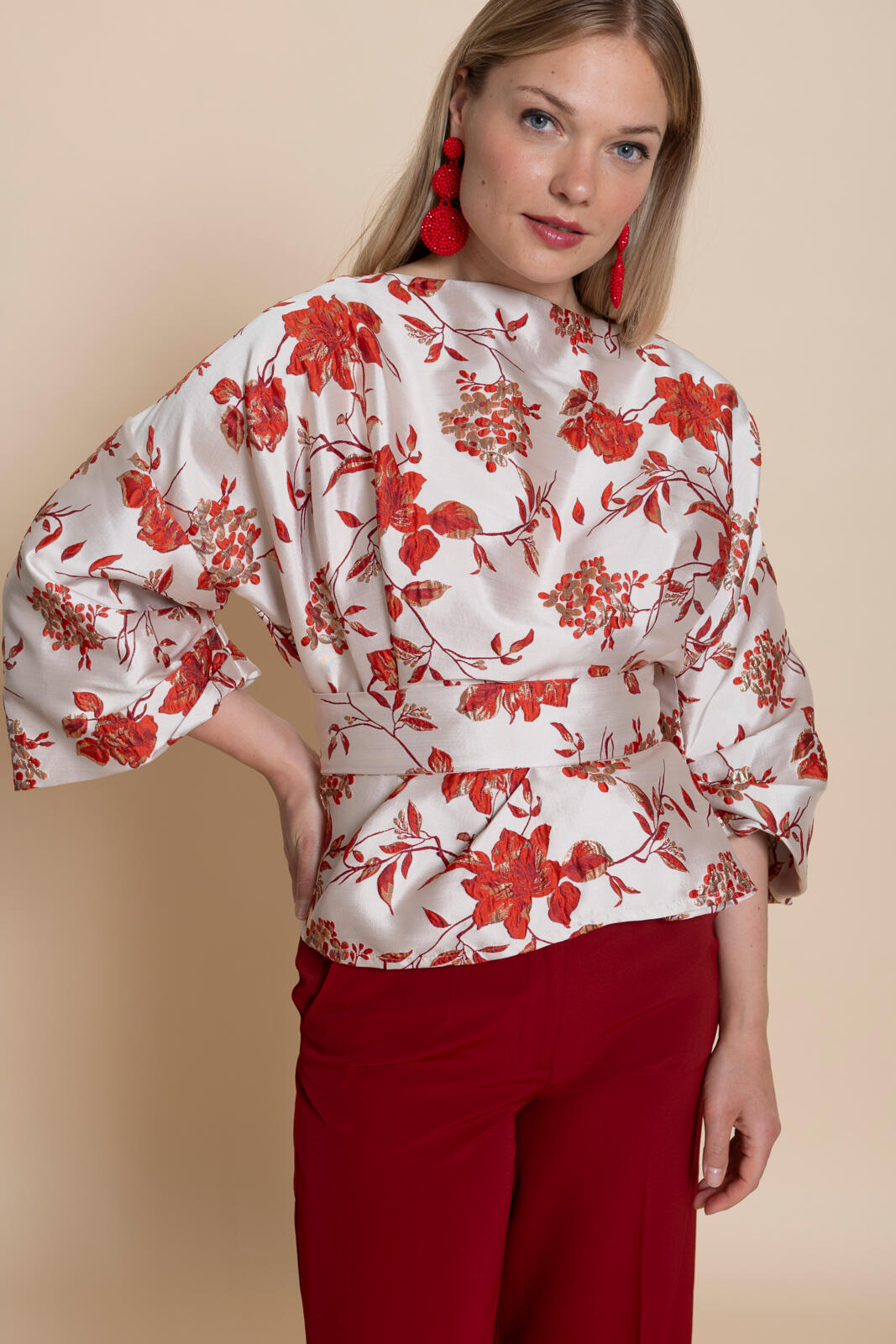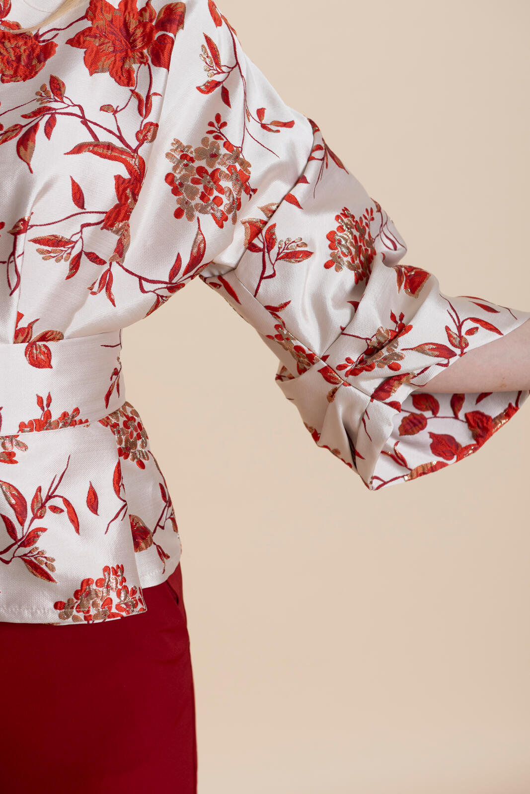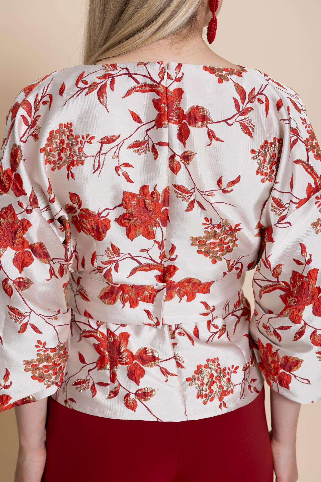 Gemaakt van gebloemd brokaat (met gouddraad), is deze top een absoluut feestelijk item. De mouwen krijgen hun speciale vorm door drie ingestikte plooitjes in de naad. De top sluit met een blinde rits achter.Neem voor een casual versie van dit model bij voorbeeld een mooi linnen.