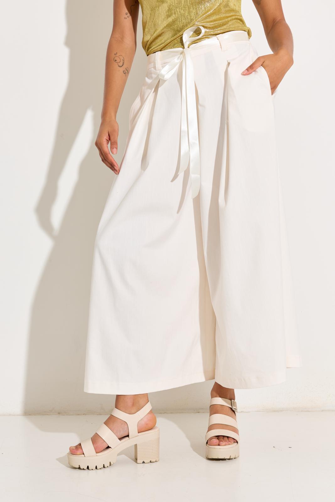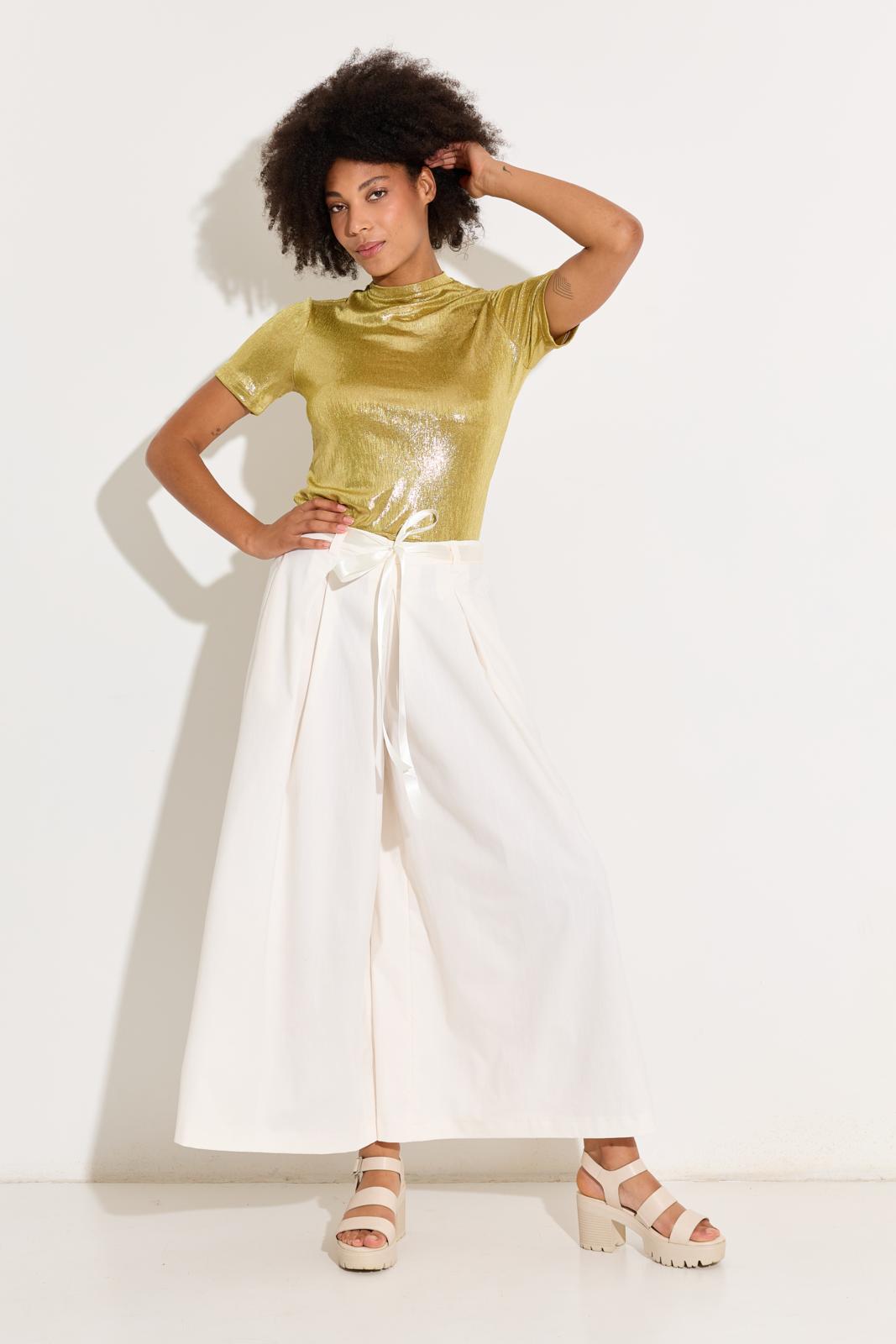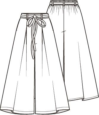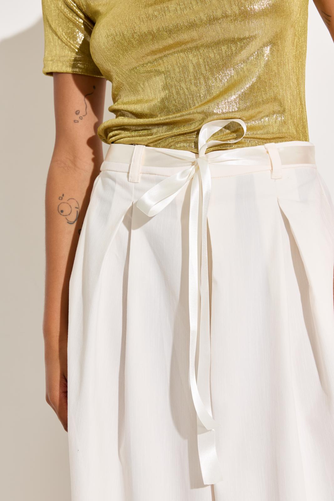 De broek heeft zulke wijde pijpen dat-ie op een maxi-rok lijkt; met elastiek in de taille en een gekocht satijnen lint als strikceintuur. Die zet je in een avond in elkaar!