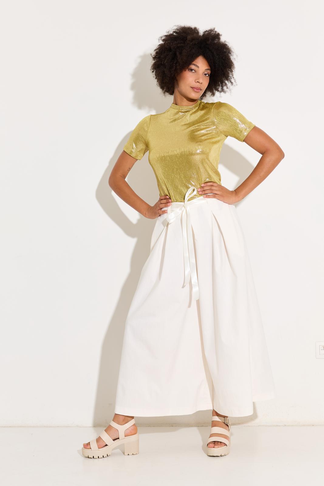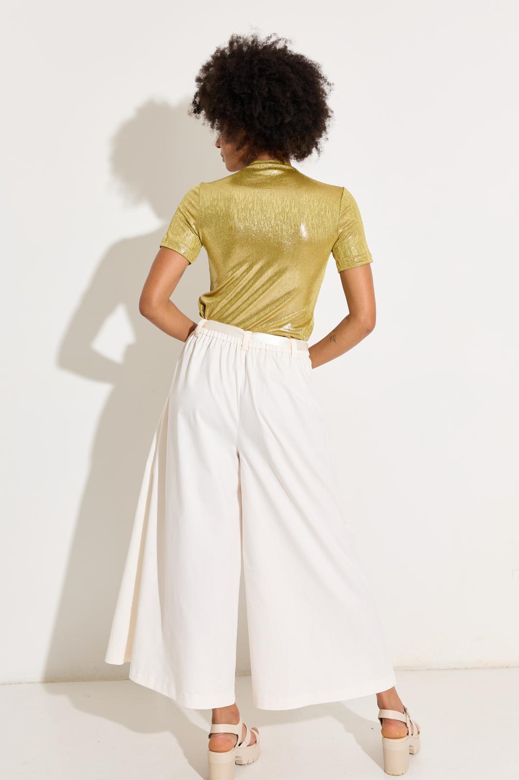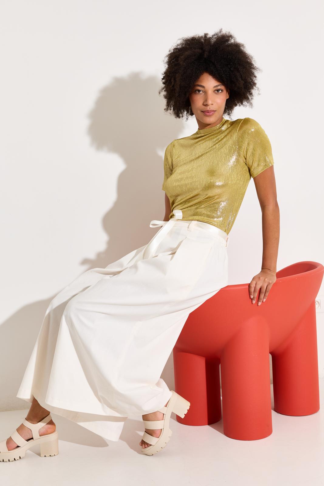 De broek heeft zulke wijde pijpen dat-ie op een maxi-rok lijkt; met elastiek in de taille en een gekocht satijnen lint als strikceintuur. Die zet je in een avond in elkaar!