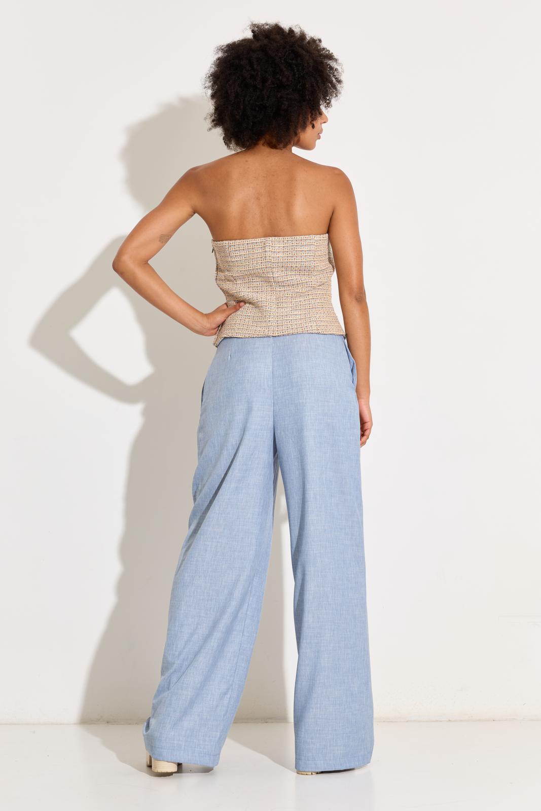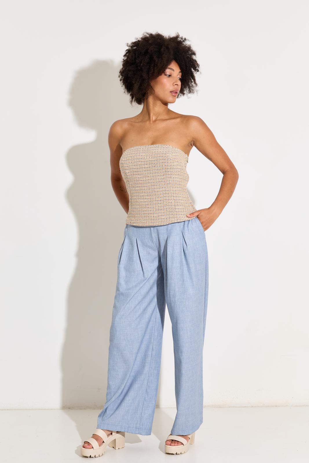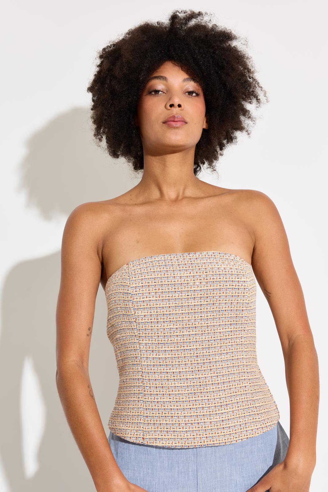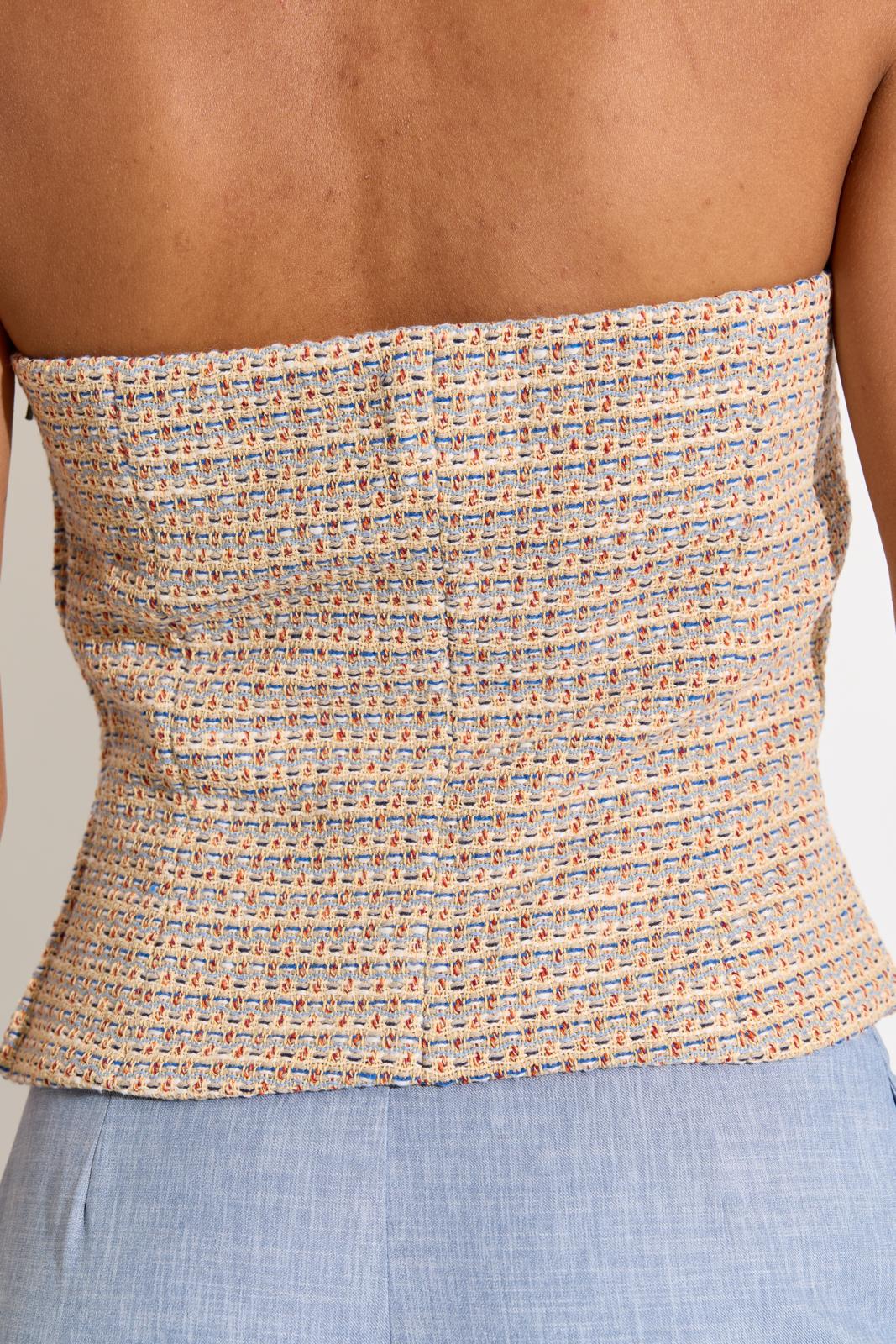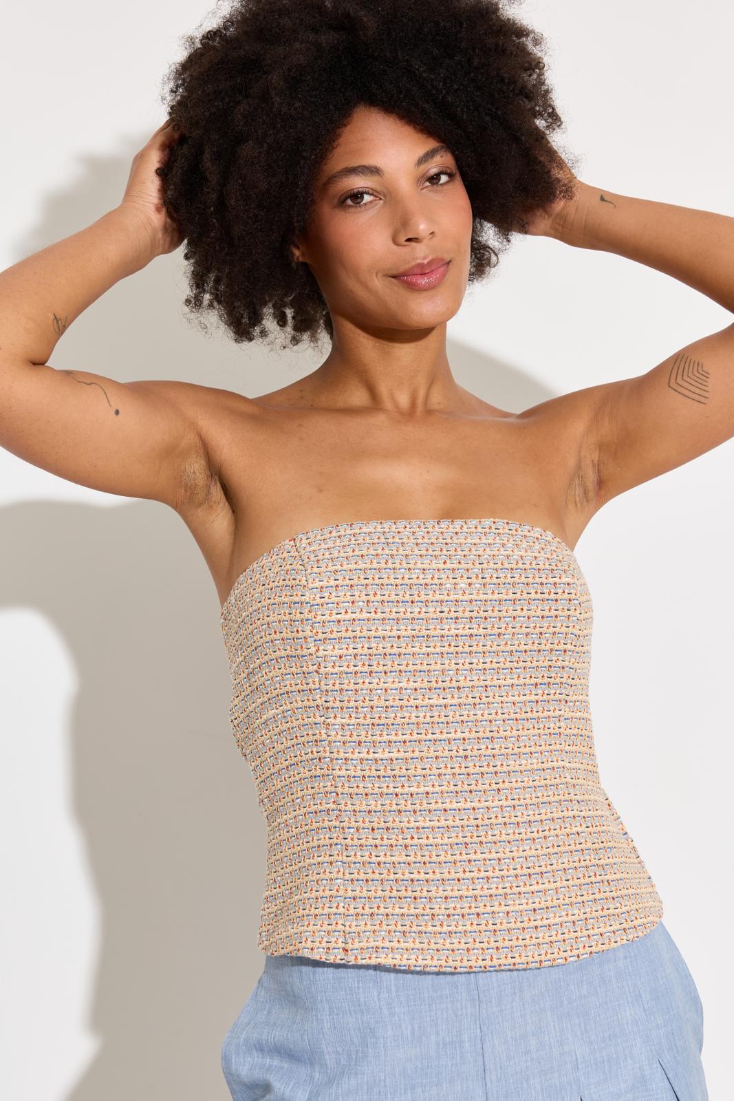De bustier – met rits in de zijnaad – krijgt een klassieke draai door de tweedstof. Stik eventueel baleinenband in de zijnaad voor extra stevigte.