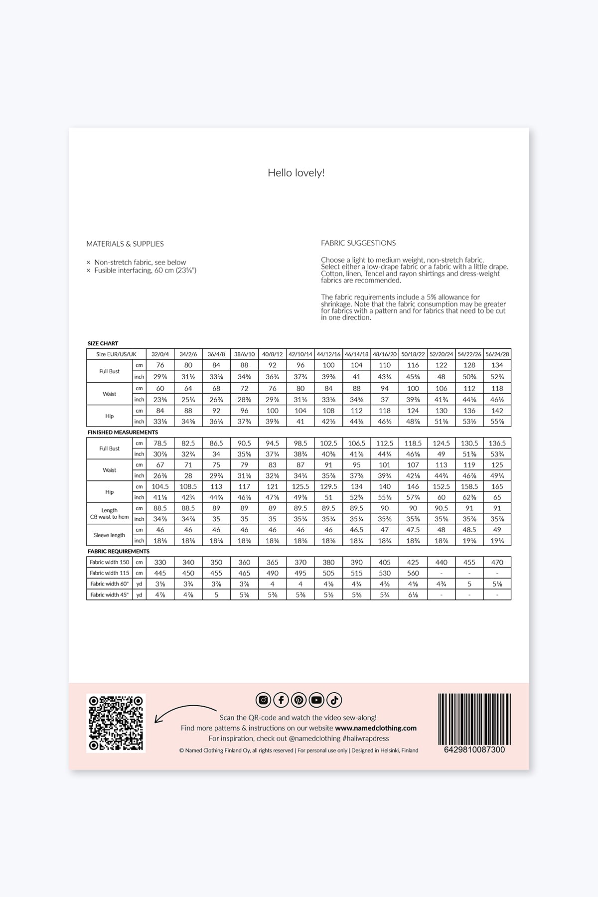 De Hali jurk is een comfortabele en stijlvol kledingstuk. Het heeft een semi overslaglijfje met een V-hals en een wikkelstriksluiting. De jurk heeft een rugpas en handige steekzakken. De jurk wordt heeft een volumineuze, enkellange cirkelrok en driekwartmouwen die aan een smal boordje gerimpeld zijn.