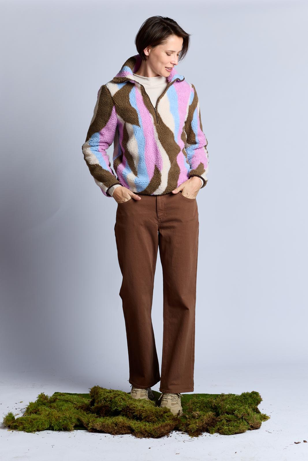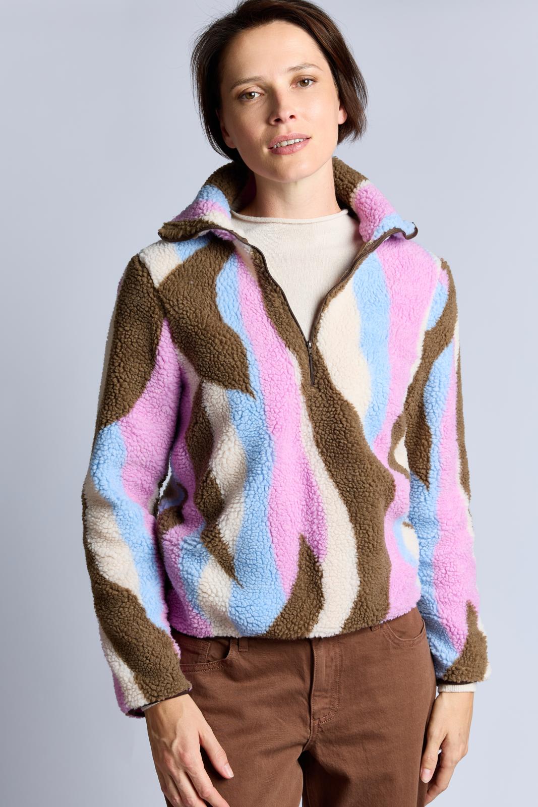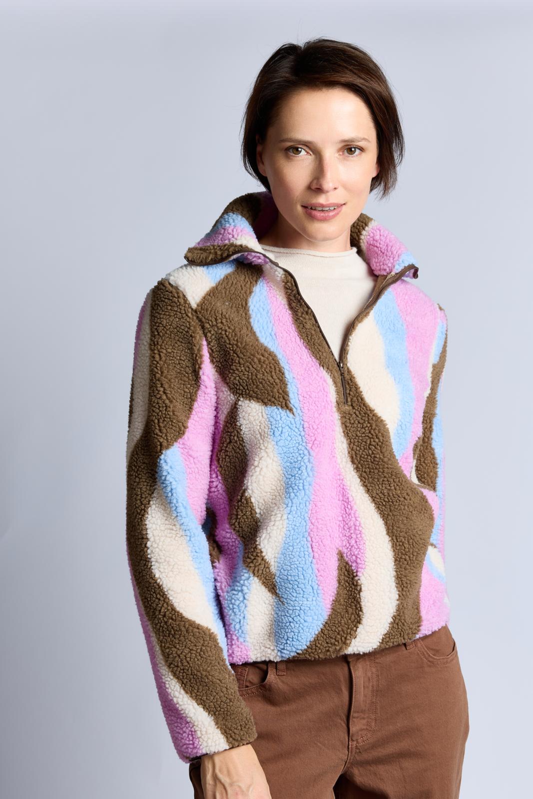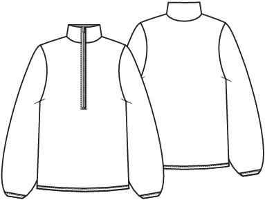 Hét kledingstuk om eropuit te trekken: de sweater met opstaande boord en rits. De randen zijn afgebiesd met elastisch biaisband.