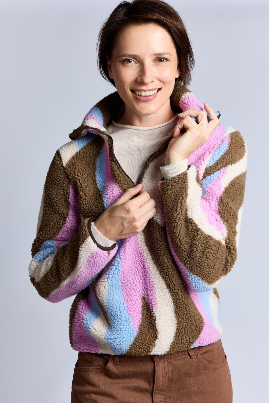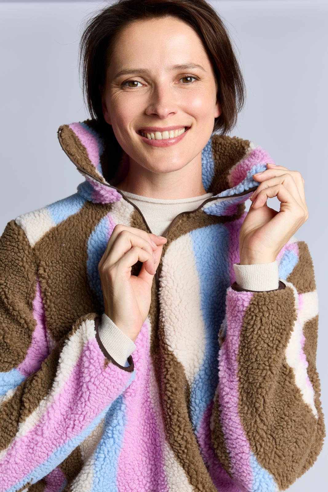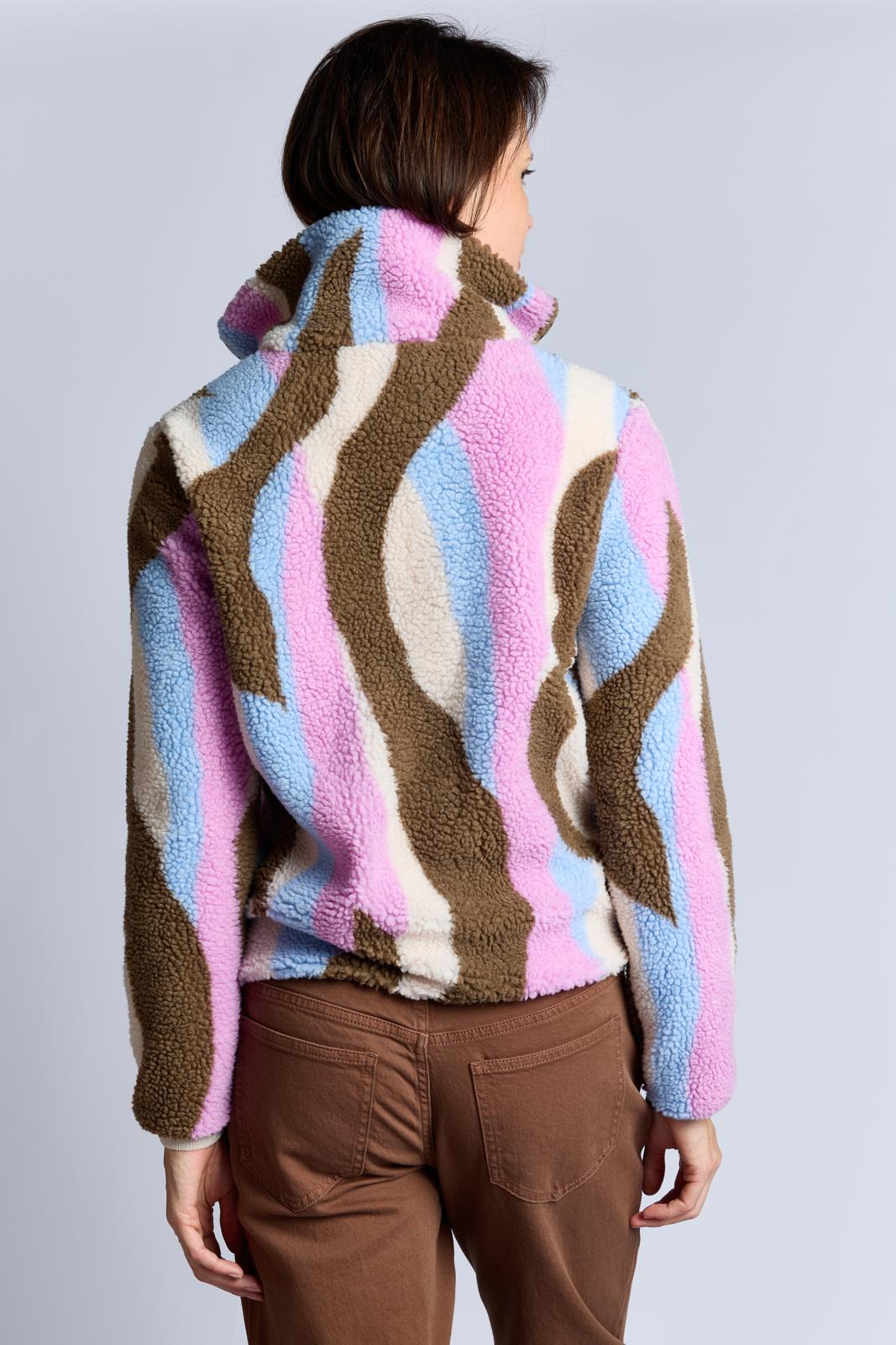 Hét kledingstuk om eropuit te trekken: de sweater met opstaande boord en rits. De randen zijn afgebiesd met elastisch biaisband.