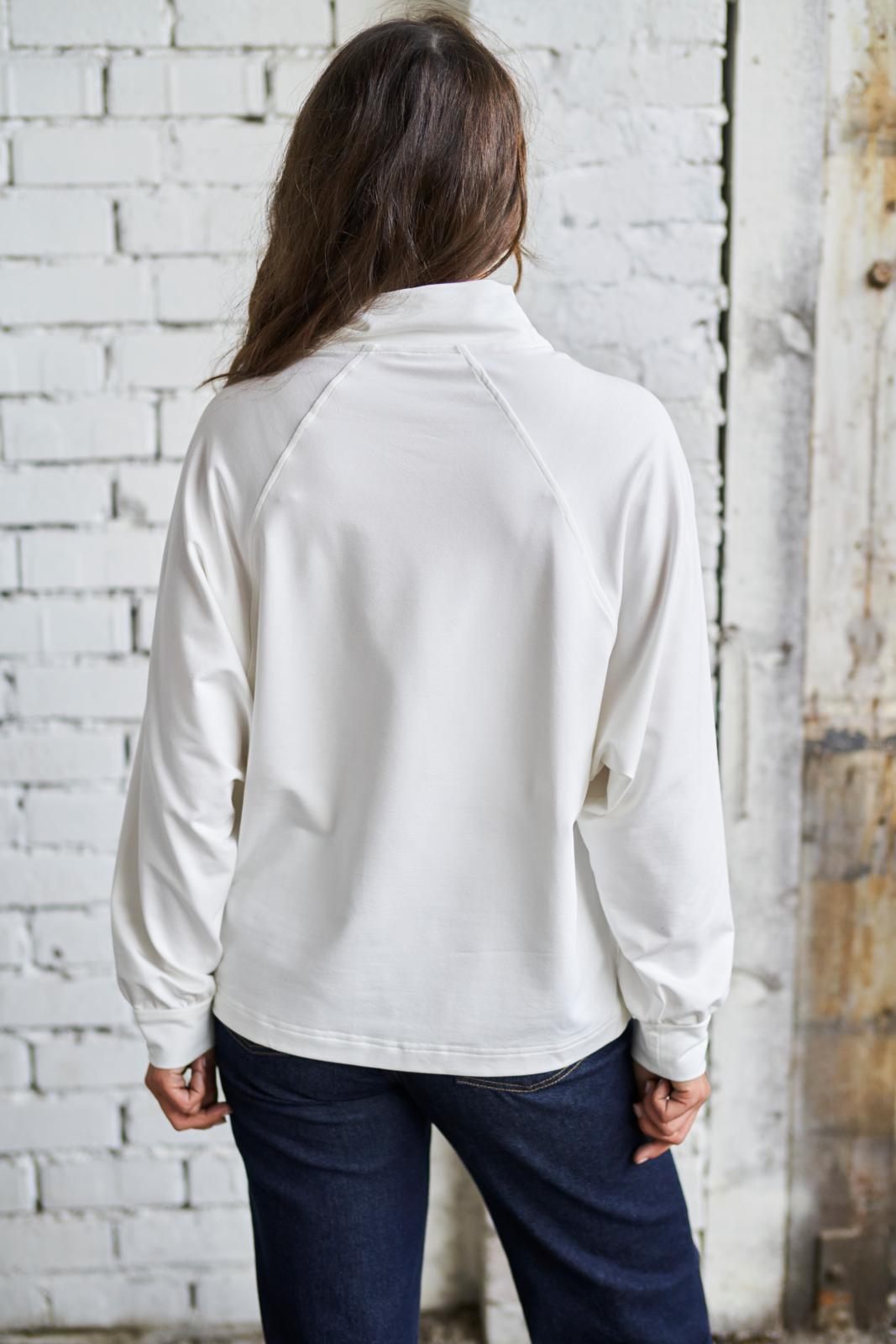 Deze trui is een lekker basisstuk van zachte French terry; net wat dikker dan gewone tricot maar dunner dan sweatstof. Hip detail zijn de diepe oversized raglanmouwen.