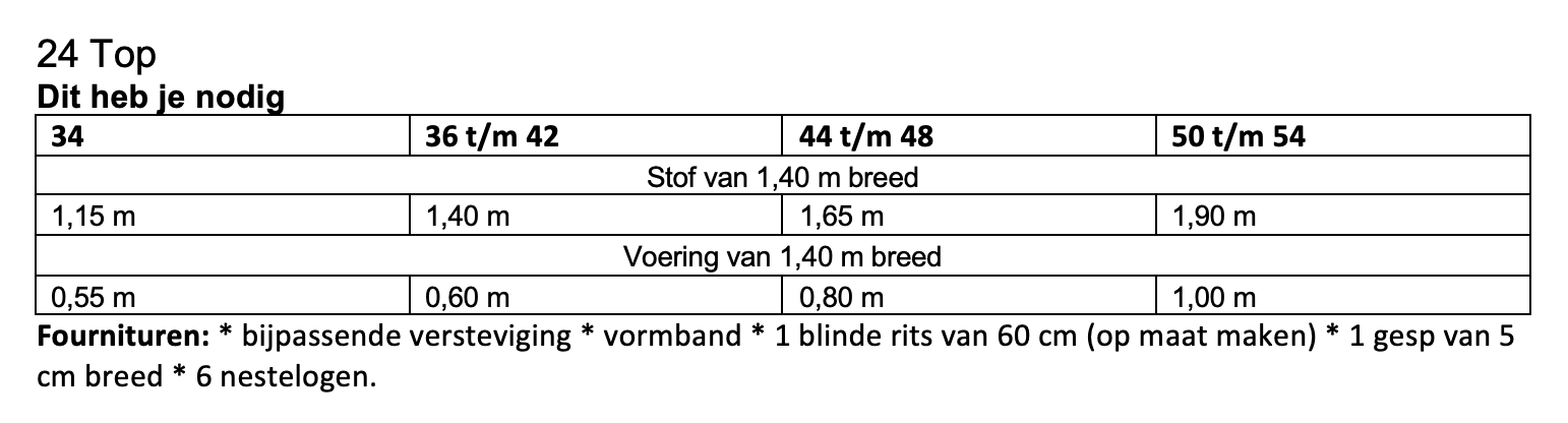 De top met peplum en blinde rits aan de achterkant, staat perfect op een rechte pantalon of jeans. De top heeft dat extra’s door het gerende schootje en de stoffen ceintuur. Een goed patroon voor een geklede stijl. Maak de top van een matte kostuumstof voor een representatieve stijl. Van een feestelijke stof zoals brokaat of jacquard voor een party-outfit.