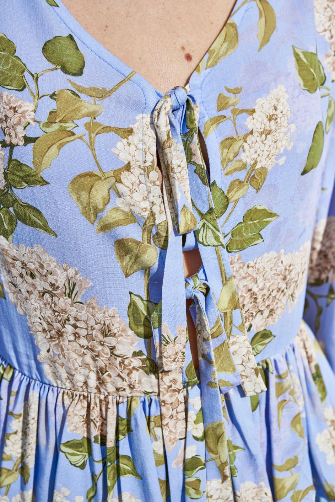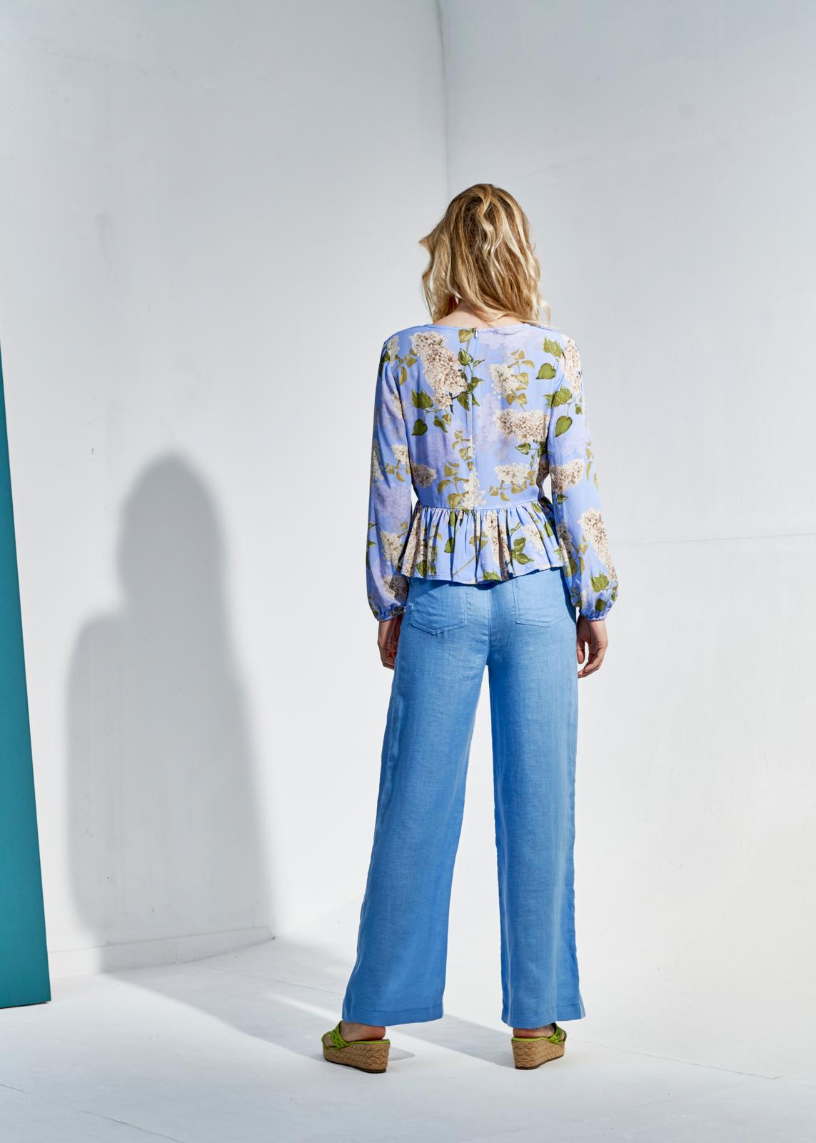 Deze sierlijke top met peplum heeft voor een diepe V-hals met striklinten voor de sier. Hij gaat aan met een lange blinde rits achter. De mouwen poffen door het elastiek onder in het zoompje.