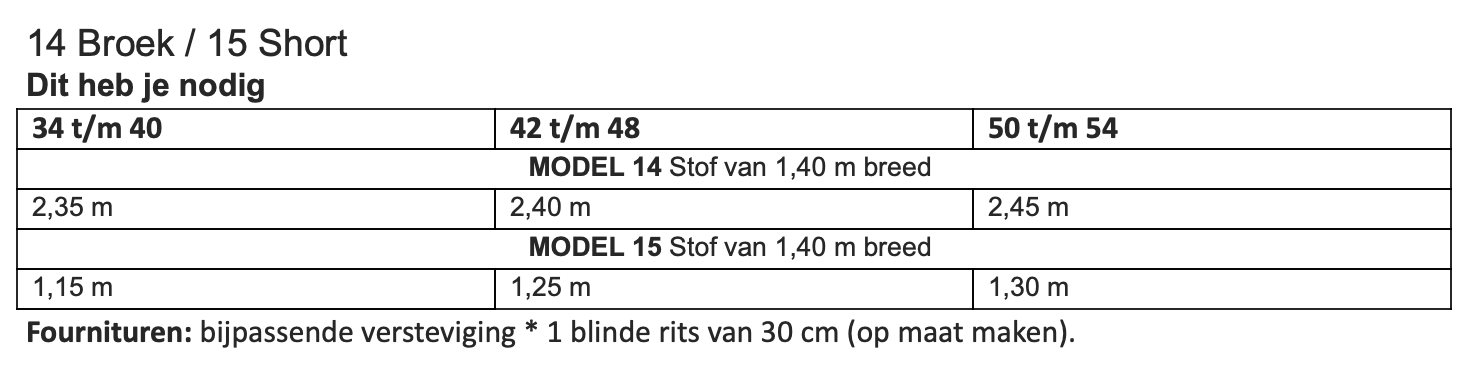 Stoffen: geweven stof eventueel met wat stretch, katoen, katoenblend, linnen, soepele denim.