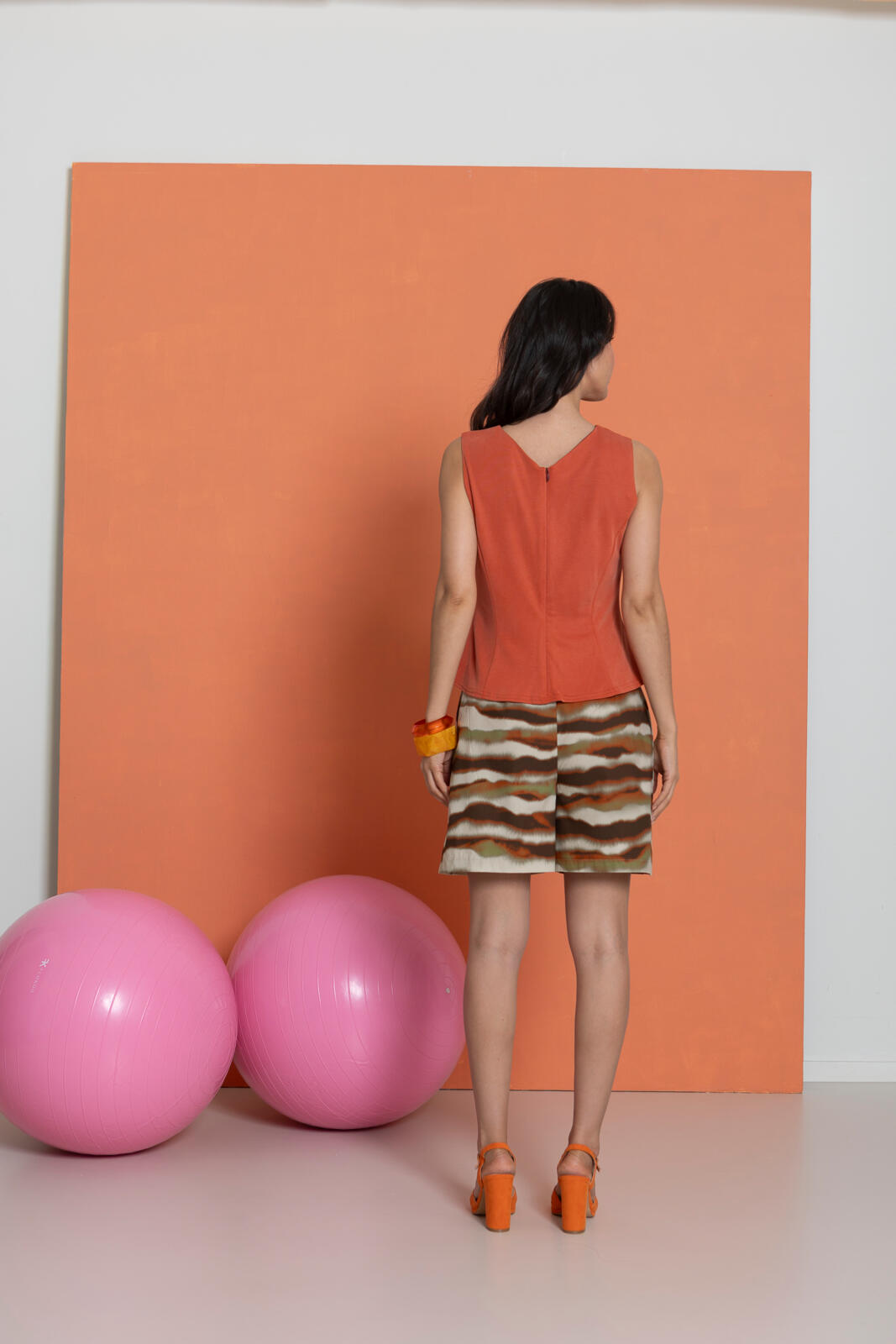 Fijne short met een nette, verzorgde uitstraling. Met een extra ingestikte plooi op de pijpen als speciaal detail. Geef de short eventueel een chique uitstraling door te kiezen voor een ‘silky’ katoen of satijnkatoen.