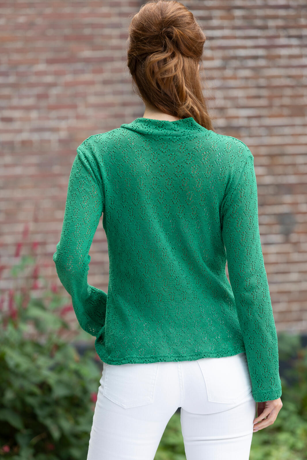 Zo'n eenvoudig, licht getailleerd truitje met hoge V-hals wordt speciaal door er bijvoorbeeld een ajourbreisel voor te gebruiken. Maar ook in een uni tricot is het een perfecte aanvulling voor je garderobe!