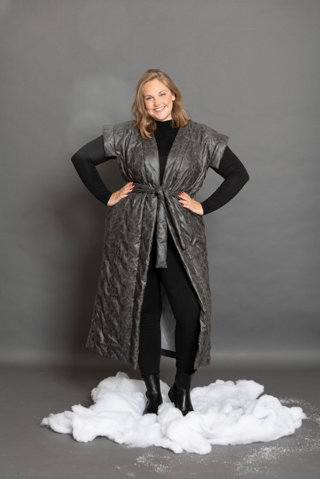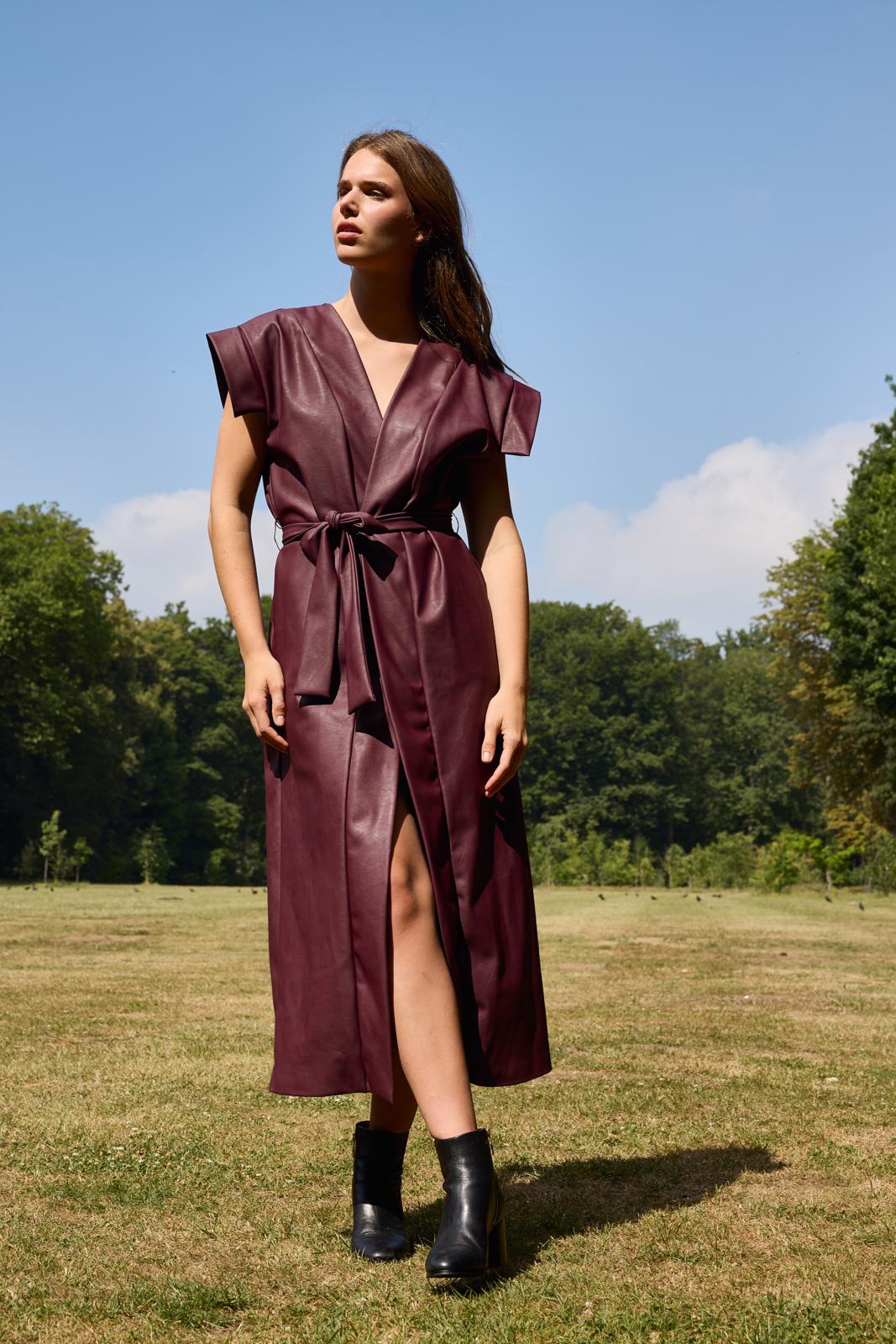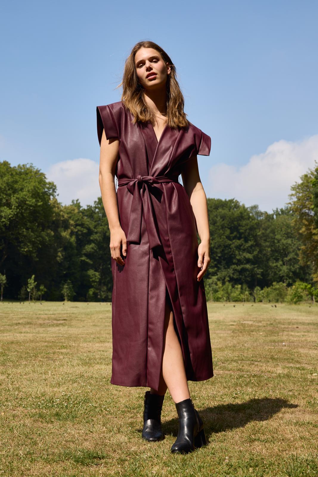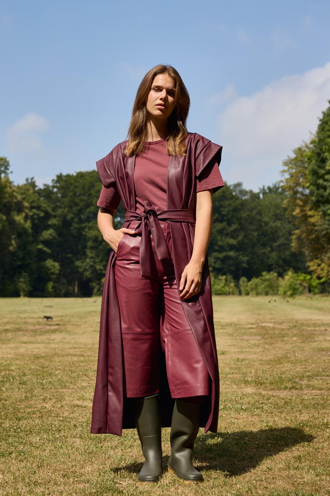 Met zo’n stoere, imitatieleren bodywarmer heb je een mooie binnenkomer. Hij heeft speciale details zoals de kapmouwtjes en brede bies. Met de losse strikceintuur creëer je een taille-accent.