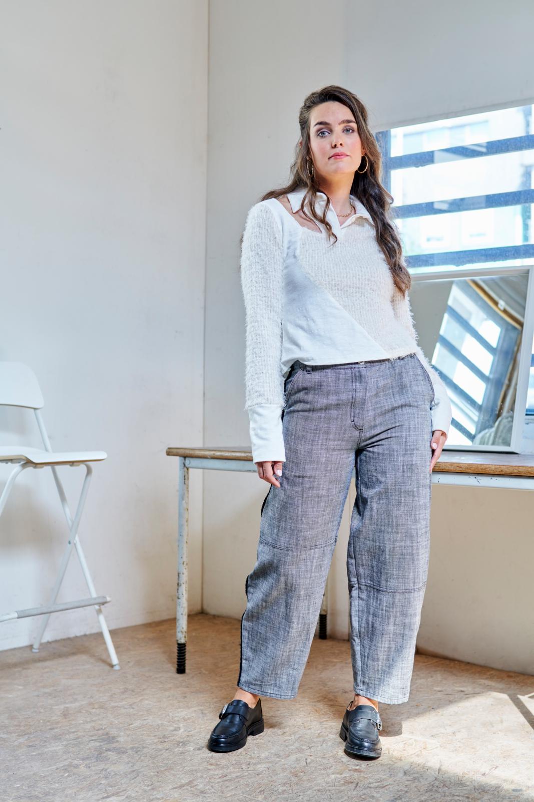 De barrel leg broek is hét nieuwe basismodel. Een stoere casual broek met ‘ronde pijpen’, achter een heuppas en opgestikte zakken. W.b. de donkerblauwe broek met sierrandje op de zijnaad; hier is de zelfkant van de stof – met rafeltjes – voor gebruikt.