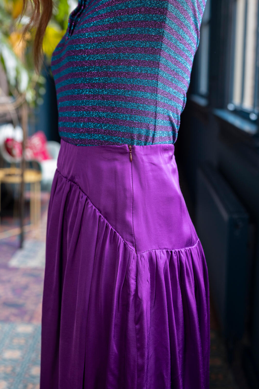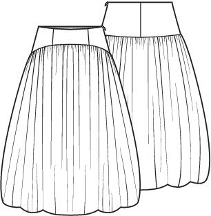 Weer helemaal terug: de ballonrok. Dit exemplaar heeft een slanke aansluitend heuppas met gebogen vorm en een blinde rits in de zijnaad. Een soepele glanzende stof maakt de rok extra feestelijk. Wil je een meer uitstaande, bollere rok, neem dan bijvoorbeeld een dunne polyester katoenblend.