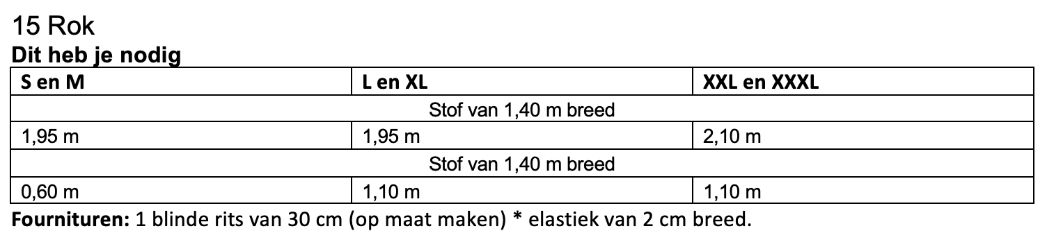Stof: soepelvallende stof, satijn, Tencel, viscose, of voor een uitstaande rok iets steviger stof.