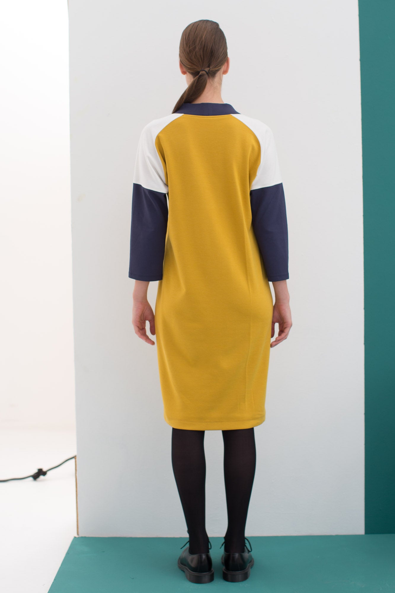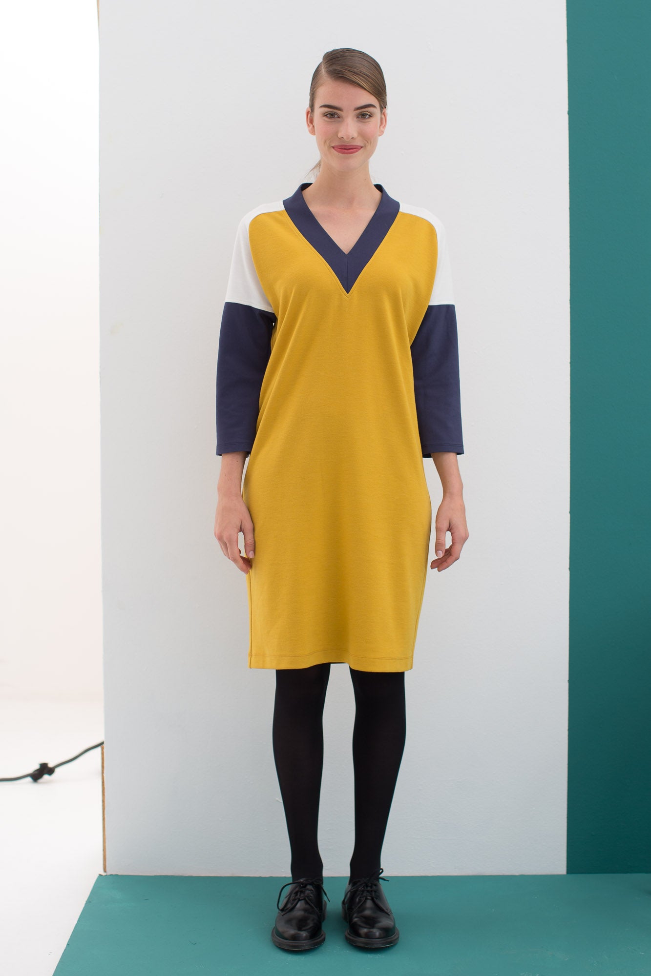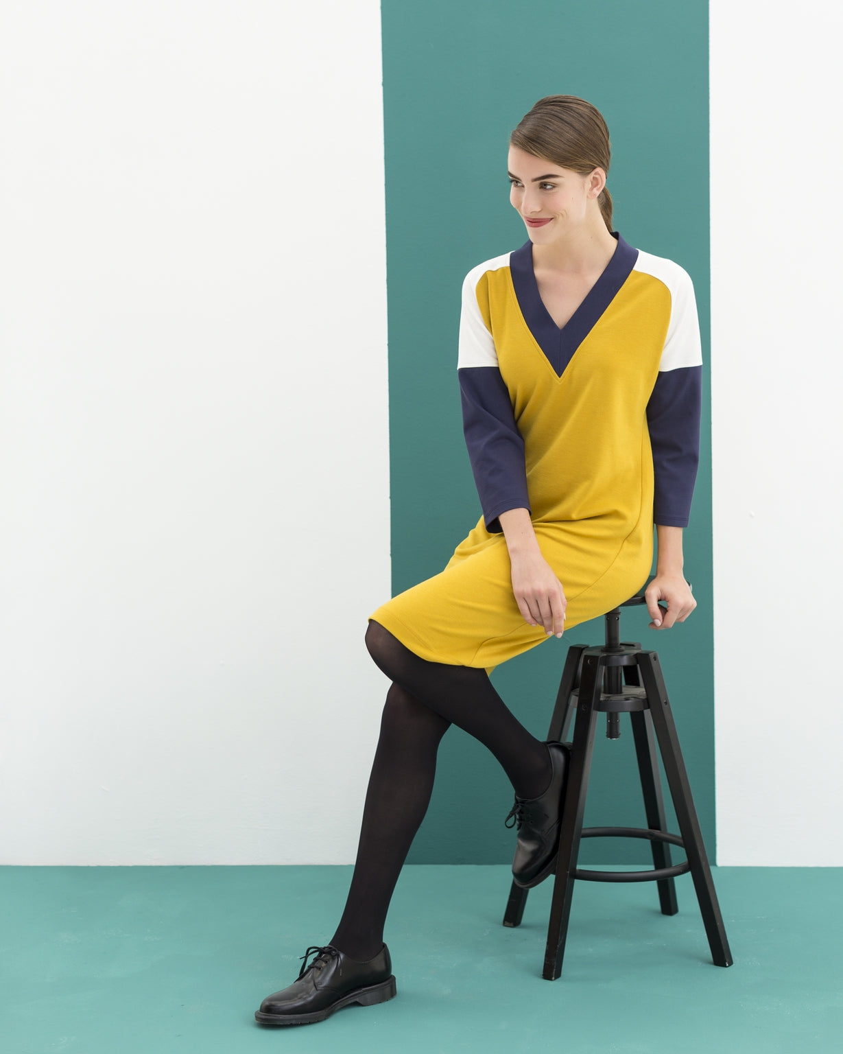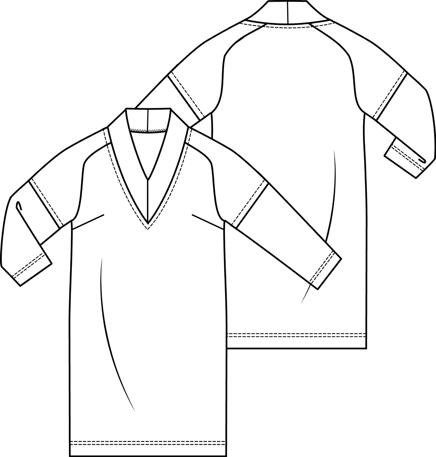 Sweater-dress, het model heeft een diepe V-hals met bies, raglanmouwen met een knik en coupenaadjes bij de buste.