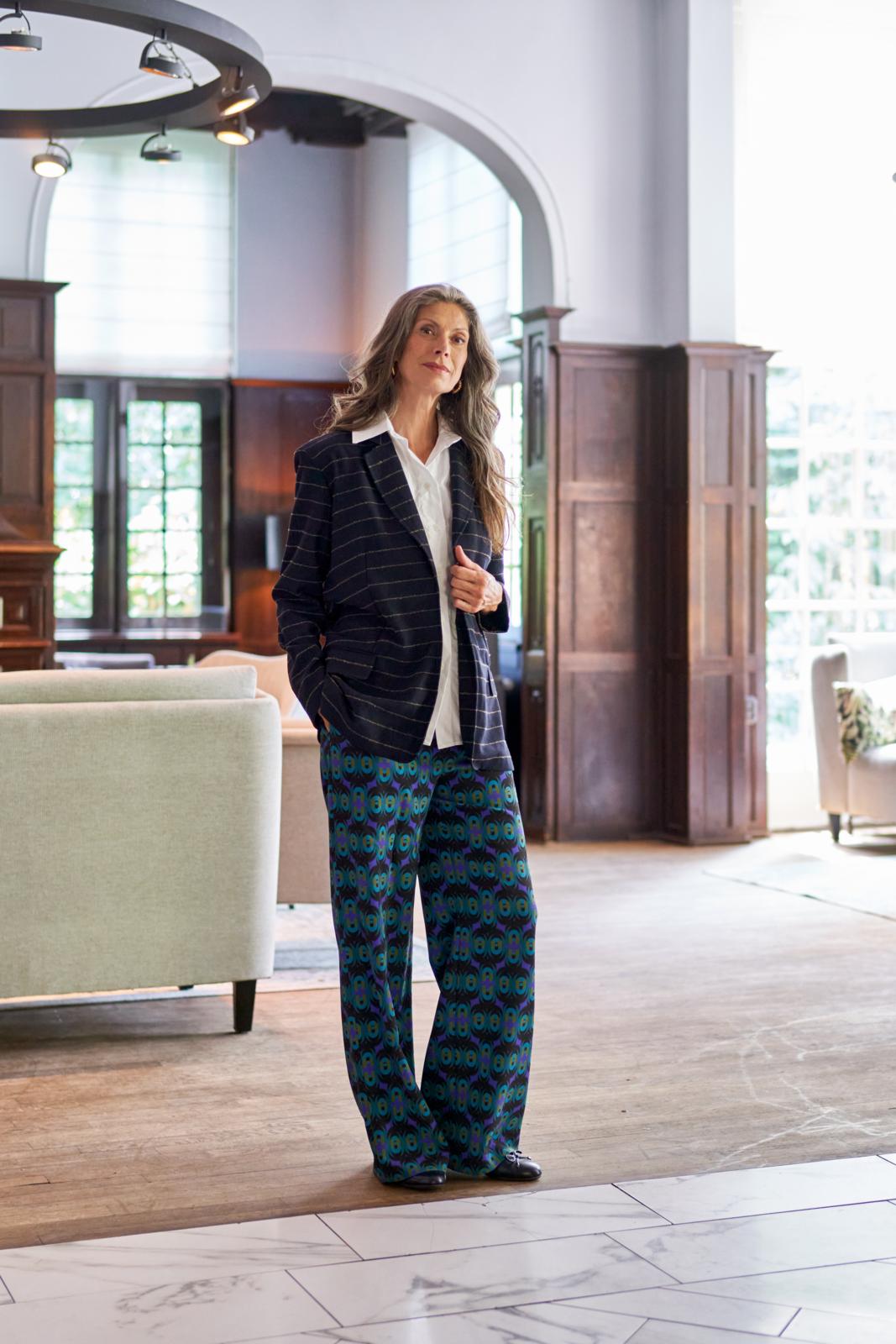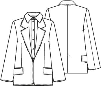 Ideaal voor een stoer-chique stijl: een los vallende blazer. Het lijkt dat er een blouse onder de blazer gedragen wordt, maar het is een 'frontje' dat tussen het beleg en de voering van het jasje is vastgestikt. Je hoeft dus nooit te denken wat je eronder aantrekt! En ja, weglaten kan natuurlijk ook eenvoudig.