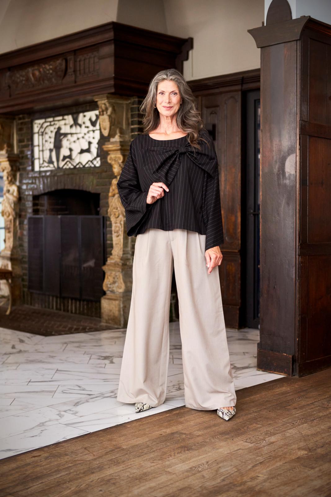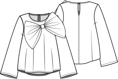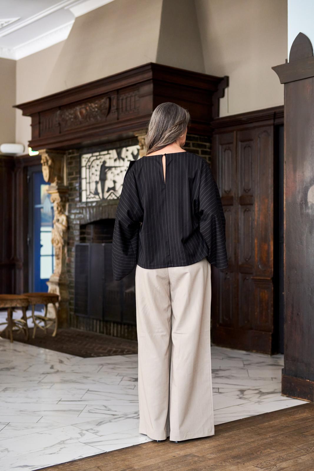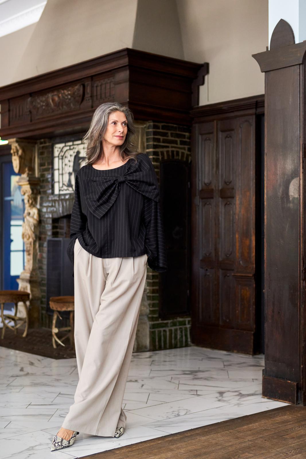 Deze wijdvallende top met aangeknipte mouwen heb je snel gemaakt! De grote strik stik je apart; hij is met een paar steken vastgezet, dus die haal je er ook weer makkelijk vanaf als je hem zat bent. De top is van een krijtstreepstof met een beetje rek.