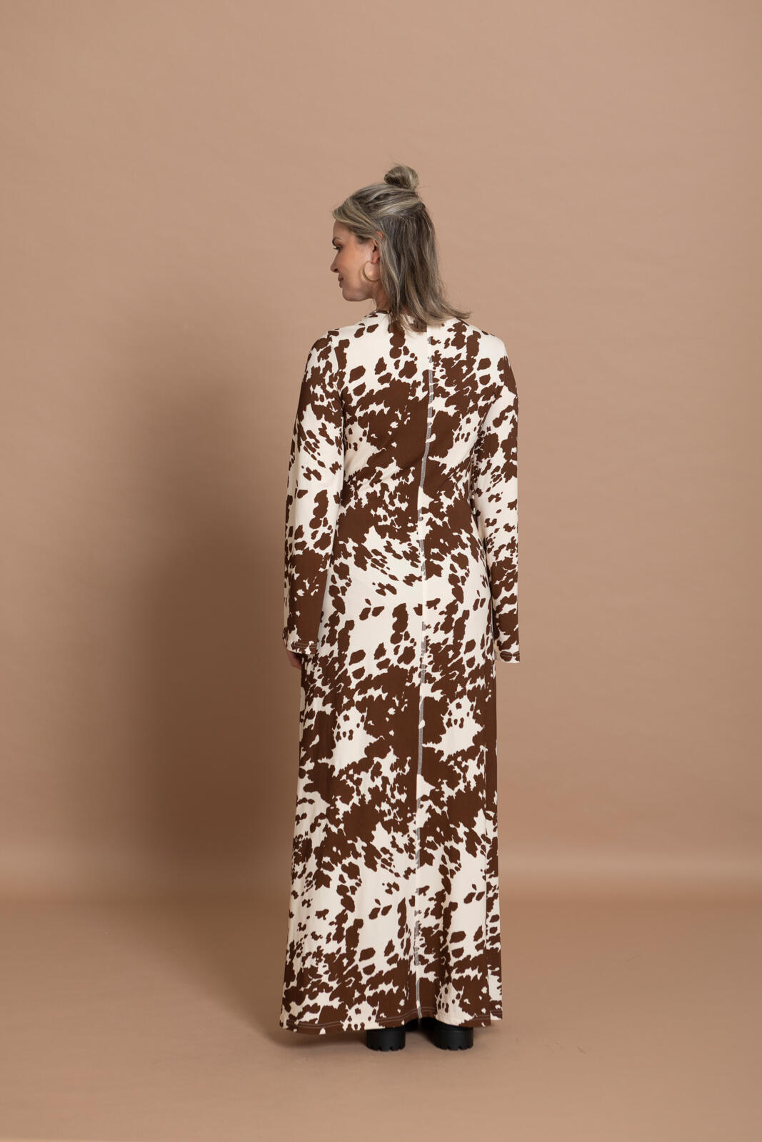 Een sluik, ruimvallend model maxi-jurk met uitlopende mouwen. Hij wordt gemaakt van tricot of steviger jersey. Middenvoor zit een lockstiksel voor de sier, waardoor de jurk minder massief oogt. Geen lockmachine in huis? Een zigzag- of stretch-steek kan ook. Je kunt er ook een knielange versie van maken.