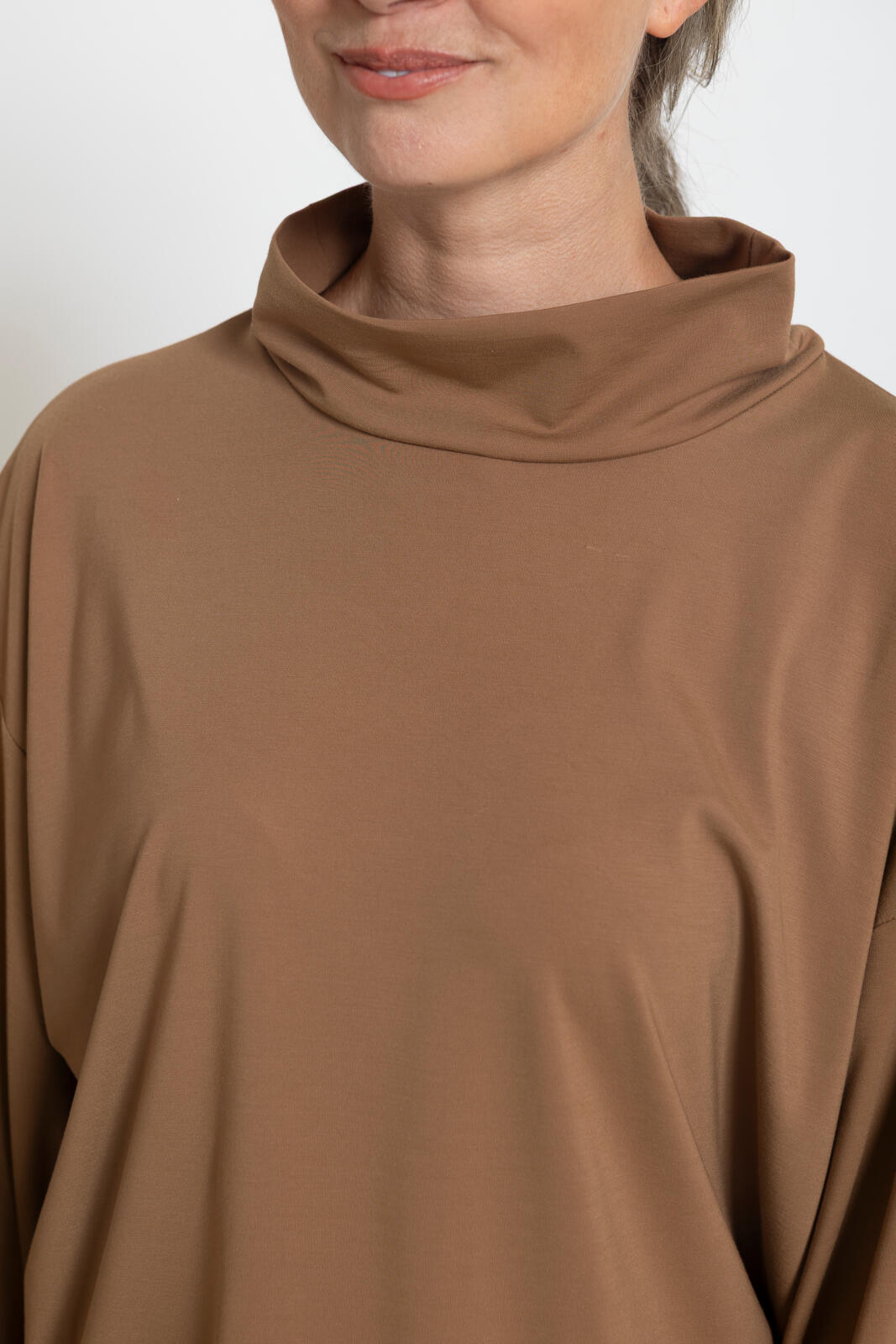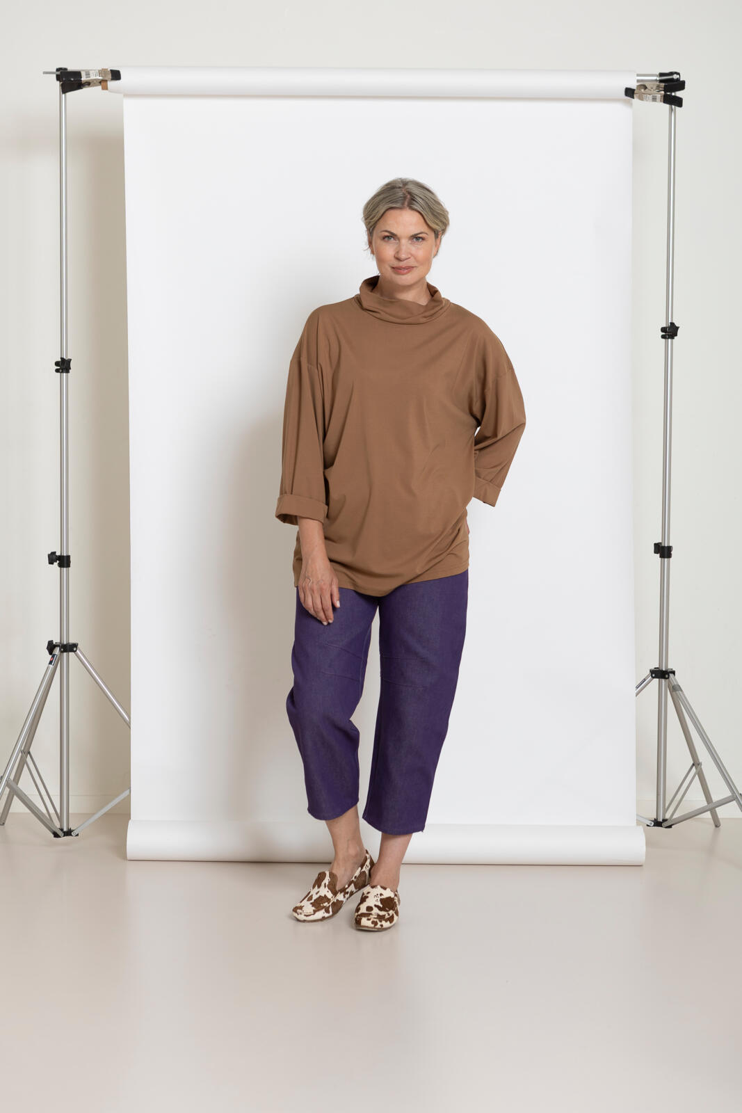 Een oversized model top met ruimvallende boord. Een nonchalant wijd model dat je maakt van tricot, het iets dikkere French Terry of een gebreide stof, uni óf een Bretonse streep.