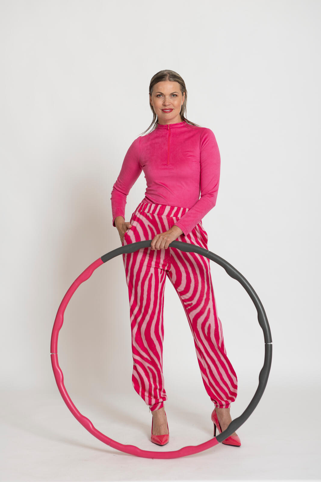 Een sportbroek met (gedeeltelijk) elastiek in de taille en onder in de pijpen. Dit model ’joggingbroek’ is uitgevoerd in jacquardtricot met glitter. Zo draag je hem niet alleen om in te sporten.
