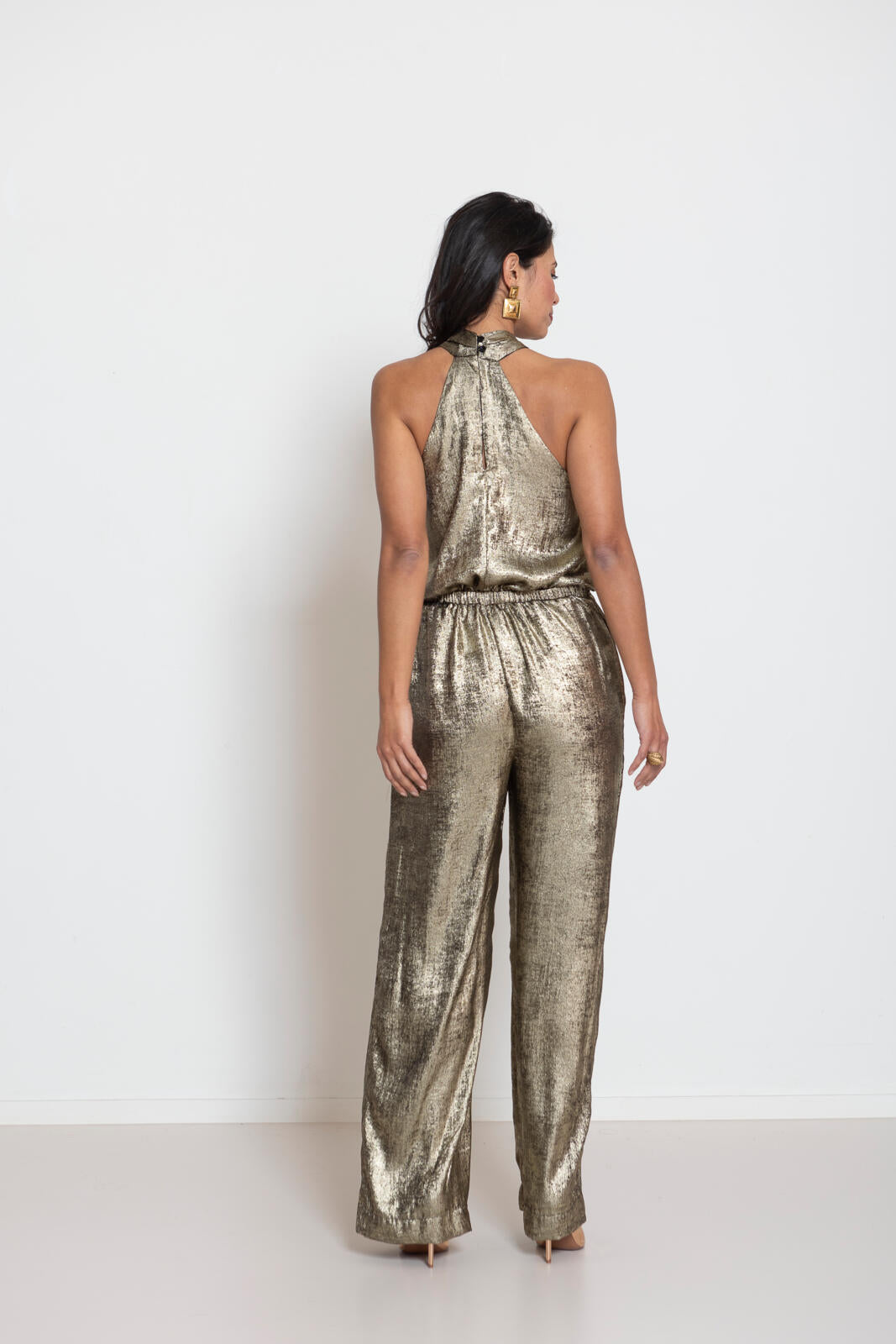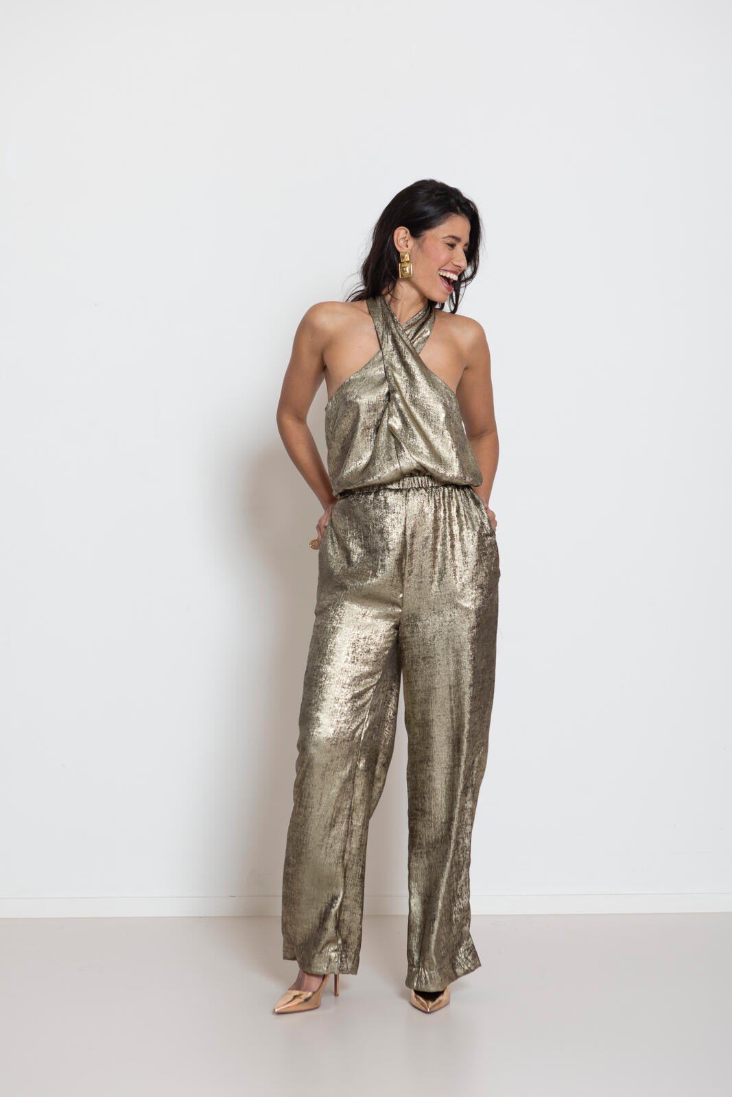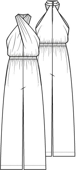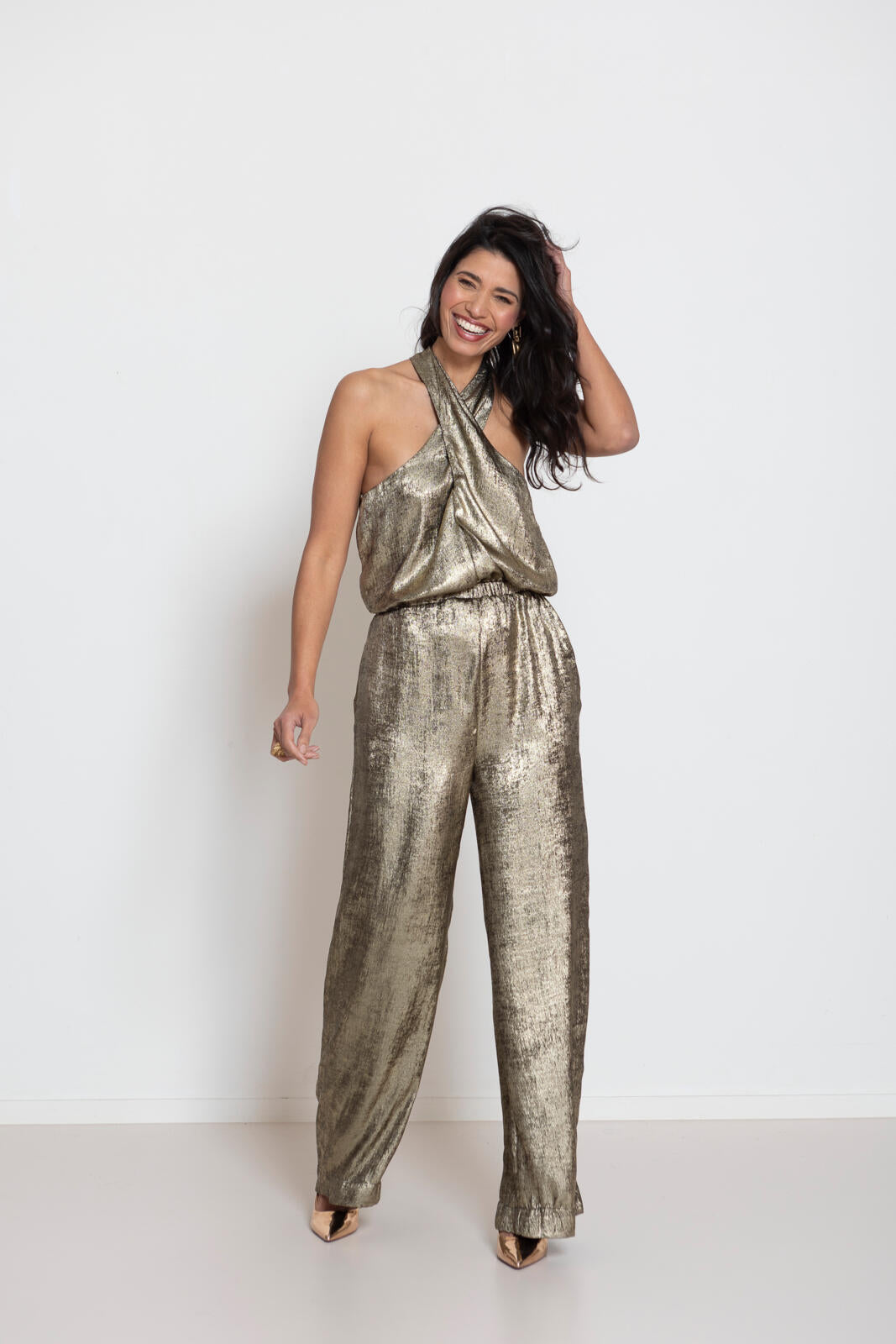 Deze grappig halterbelijning, waarbij de banden kruislings verwerkt zijn, geeft meteen een hippe look! Een chic pak dat lekker zit door het elastiek in de taille. De broek met wijde pijpen staat extra stijlvol als je hem een beetje aan de lange kant laat.