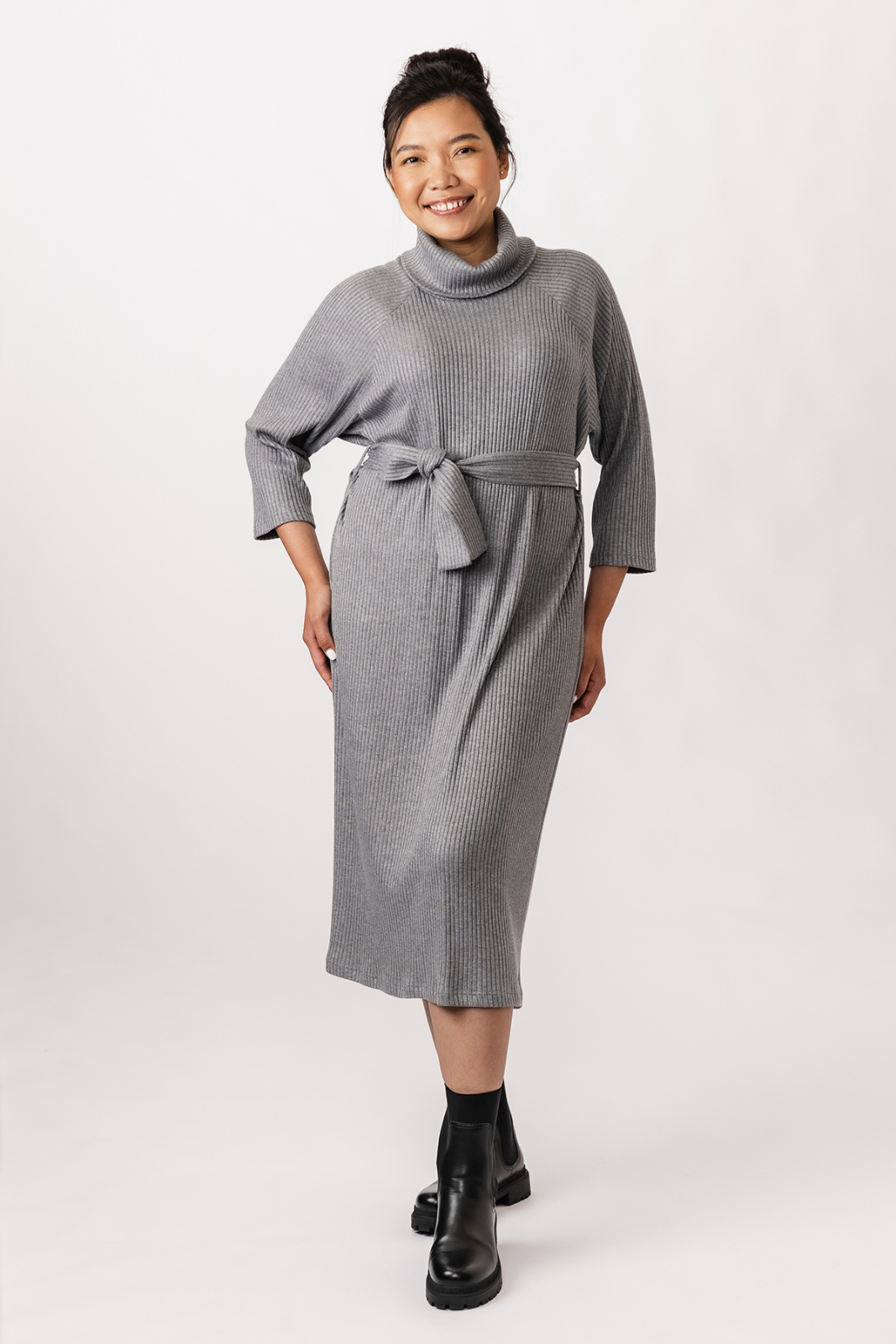Het Salla naaipatroon is een heerlijk eenvoudig ontwerp voor een gebreide midi-jurk met een rechte snit, raglanmouwen en een hoge col. De ontspannen mouwen lopen subtiel taps toe naar de pols, wat zorgt voor een elegante pasvorm.